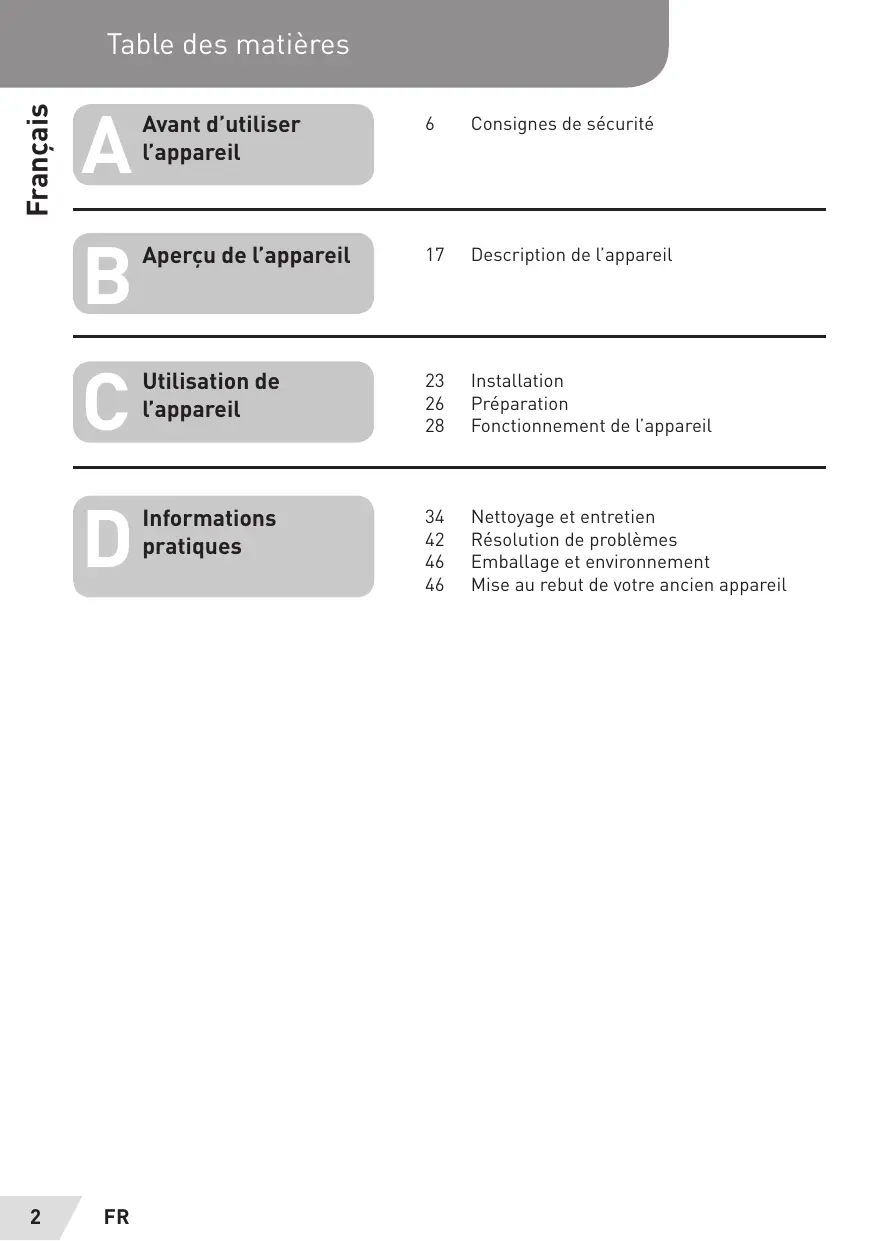 Avant d'utiliser 6 Consignes de sécurité l'appareil Aperçu de l'appareil 17. Description de l'appareil Utilisation de 23 Installation l'appareil 26 Préparation 28 Fonctionnement de l'appareil Informations 34 Nettoyage et entretien Etc 42 Résolution de problèmes P ques 46 Emballage et environnement 46 Mise au rebut de votre ancien appareil