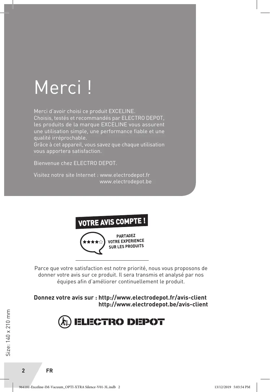 Parce que votre satisfaction est notre priorité, nous vous proposons de donner votre avis sur ce produit. Il sera transmis et analysé par nos équipes afin d'améliorer continuellement Le produit. Donnez votre avis sur : http://www.electrodepot.fr/avi http://www.electrodepot.be/avis- TRO DEPOT Size: 140 x 210 mm 2 FR 964181-Exceline-IM-Vacuum_OPTI-XTRA Silence-VOI-3Lindb 2 1A27019 503.54 PM