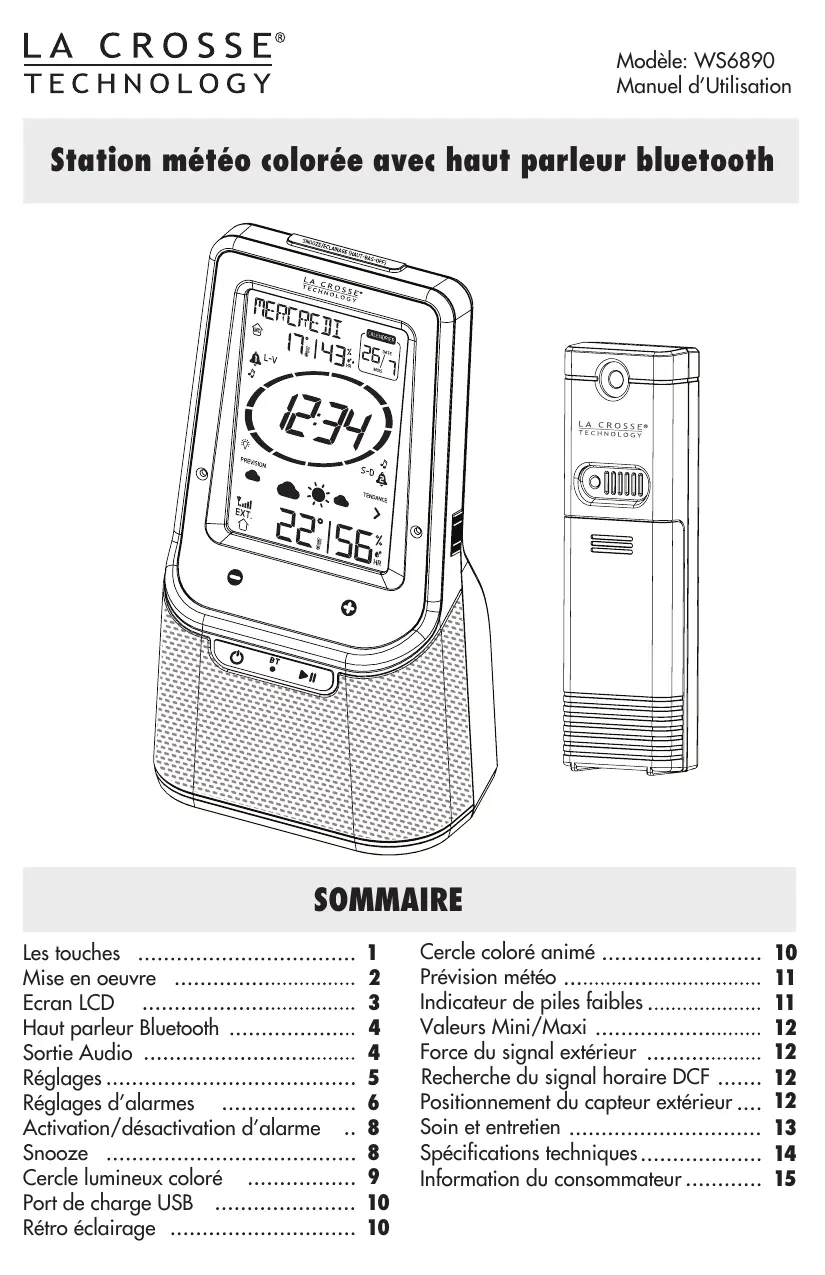 LA CROSSE” TECHNOLOGY Modèle: WS6890 Manuel d'Utilisation Station météo colorée avec haut parleur bluetooth SOMMAIRE Les touches Mise en oeuvre Ecran LCD Haut parleur Bluetooth Sortie Audio . Réglages … Réglages d’alarmes Activation/désactivation Snooze Cercle lumineux coloré Port de charge USB Rétro éclairage … Ss°voausRwN— Cercle coloré animé 10 Prévision météo …... 11 Indicateur de piles faibles . 11 Valeurs Mini/Maxi 12 Force du signal extérieur . Recherche du signal horaire DCF Positionnement du capteur extérieur … 12 Soin et entretien Spécifications technique: Information du consommateur .