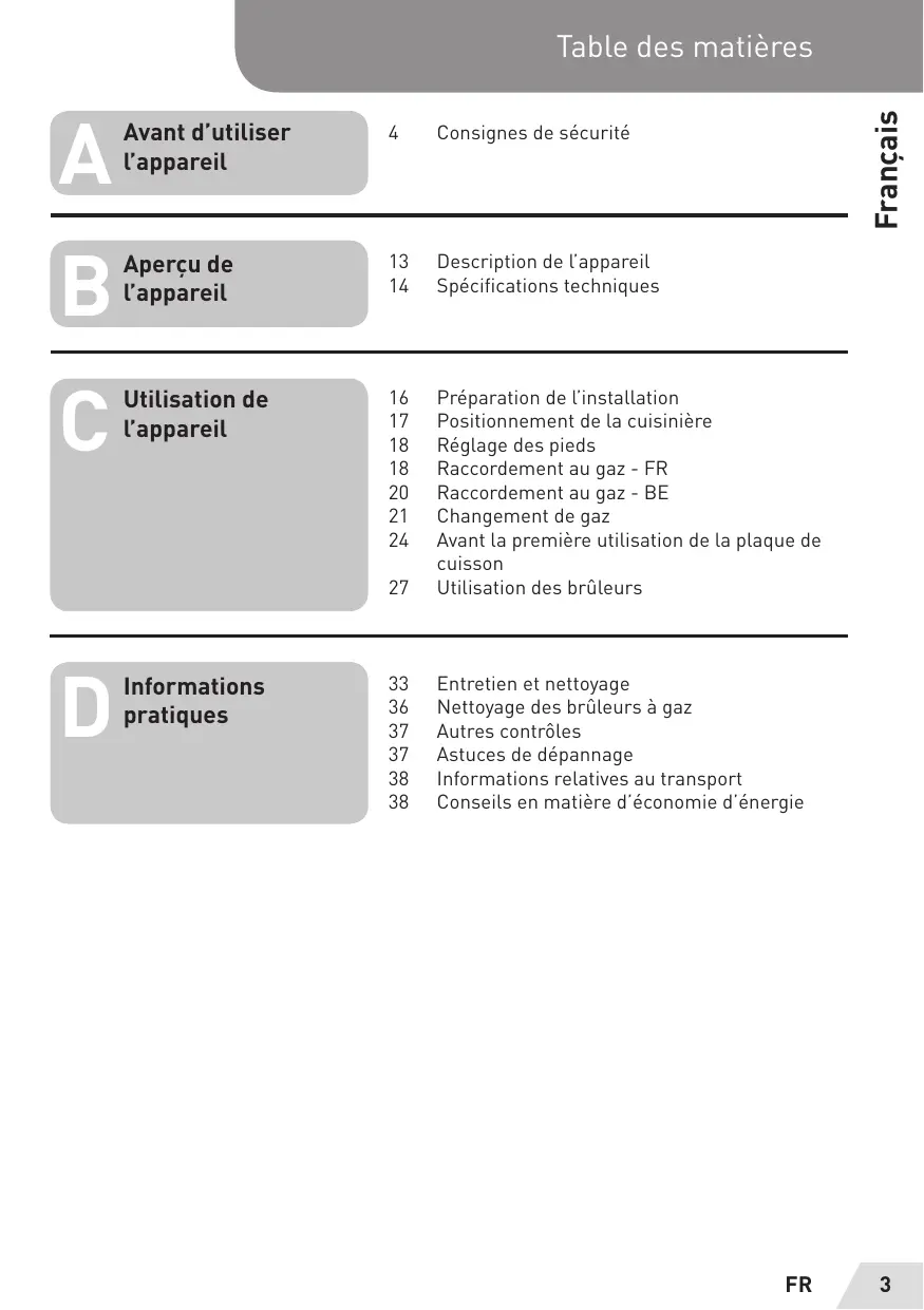Table des matières AT 4 Consignes de sécurité 13 Description de l'appareil 14 Spécifications techniques 16 Préparation de l'installatio C 17 Positionnement de La cuisinière 18 Réglage des pieds 18 Raccordement au gaz - FR 20 Raccordement au gaz - BE 21 Changement de gaz 24 Avant la première utilisation de La plaque de cuisson 27 Utilisation des brûleurs 33 Entretien et nettoyage 36 Nettoyage des brûleurs à gaz 37 Autres contrôles 37 Astuces de dépannage 38 Informations relatives au transport 38 Conseils en matière d'économie d'énergie