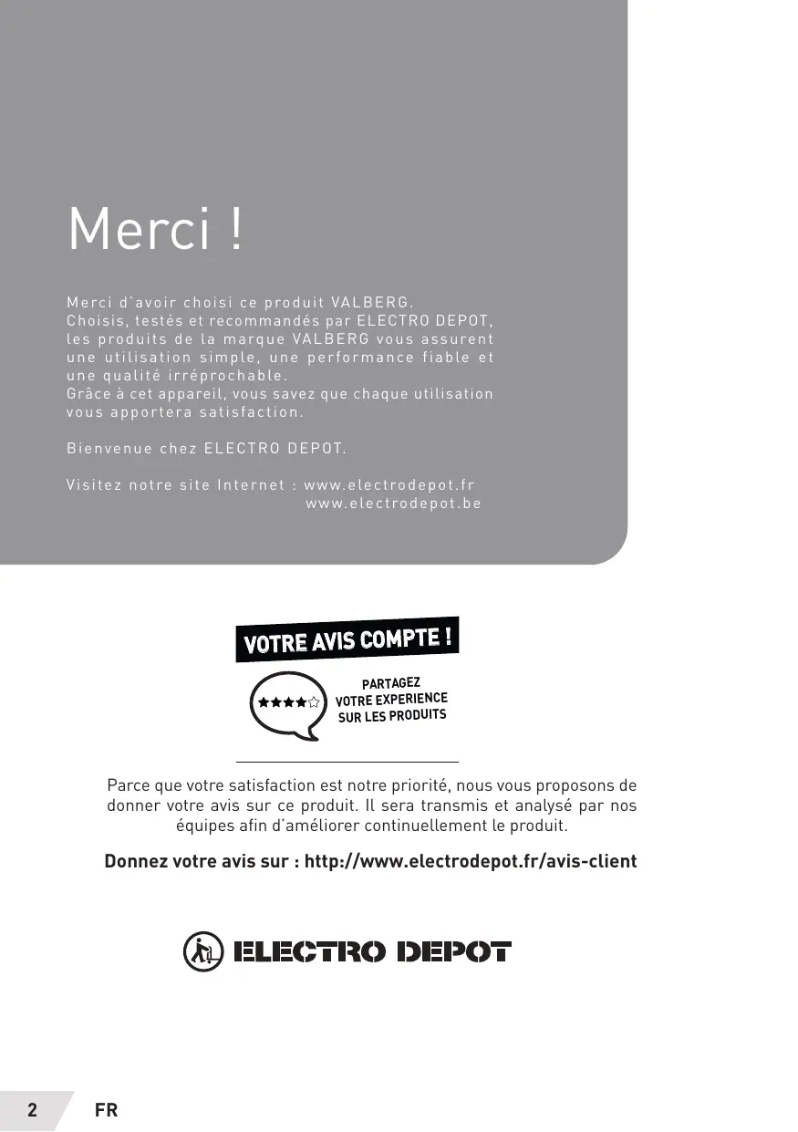 Merci | oir choisi ce produit VALBERG Choisis, testés et recommandés par ELECTRO DEPOT, les produits de La marque VALBERG vous assurent une utilisation simple, une performance fiable et une qualité irréprochable Grâce à cet appareil, vous savez que chaque util vous apportera satisfaction Bienvenue chez ELECTRO DEPOT. Visitez notre site Internet : www.electrodepot.fr www.electrodepot.be VOTRE AVIS COMPTE ! PARTAGEZ VOTRE EXPERIENCE