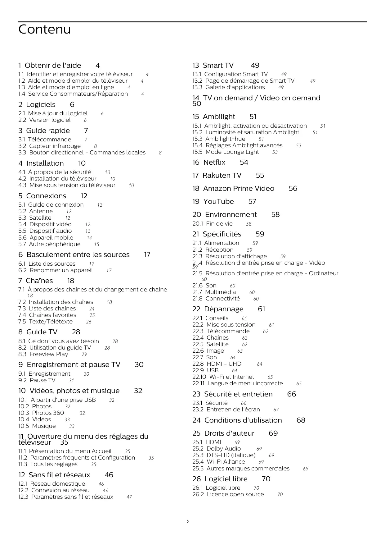 Contenu 1 Obtenir de l'aide 4 11 Identifier et enregistrer votre téléviseur 4 12 Aide et mode d'emploi du téléviseur 4 13 Aide et mode d'emploi en ligne 4 14 Service Consommateurs/Réparation 4 2 Logiciels 6 21 Mise à jour du logiciel 6 22 Version logiciel 6 3 Guide rapide 7 31 Télécommande 7