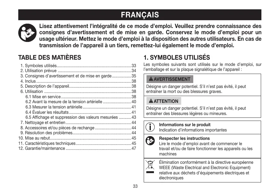 11. Caractéristiques techniques 12. Garantie/maintenance Lire le mode d'emploi avant de commencer le travail et/ou de faire fonctionner les appareils ou les machines
