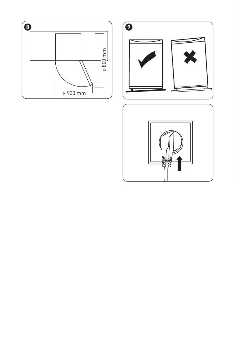 © La puerta del aparato debe poder abrirse totalmente, como indica la ilustraciôn (An. 87 x AL. 105 x Pr. 107). Para colocar el aparato a nivel, ajustes Las dos patas de estabilizaciôn situadas (9) en la parte frontal del aparato. Si el aparato no esté a nivel, La puerta y La junta de estanqueidad magnética podrian no estar alineadas.