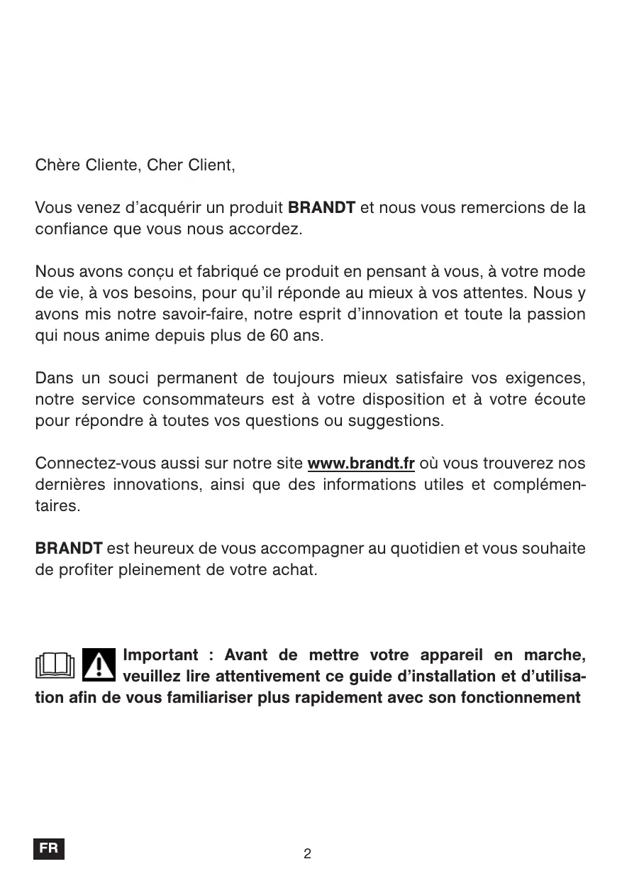 Chère Cliente, Cher Client, Vous venez d'acquérir un produit BRANDT et nous vous remercions de la confiance que vous nous accordez. Nous avons conçu et fabriqué ce produit en pensant à vous, à votre mode de vie, à vos besoins, pour qu'il réponde au mieux à vos attentes. Nous y avons mis notre savoir-faire, notre esprit d'innovation et toute la passion qui nous anime depuis plus de 60 ans. Dans un souci permanent de toujours mieux satisfaire vos exigences, notre service consommateurs est à votre disposition et à votre écoute pour répondre à toutes vos questions ou suggestions. Connectez-vous aussi sur notre site www.brandit.fr où vous trouverez nos dernières innovations, ainsi que des informations utiles et complémen- taires. BRANDT est heureux de vous accompagner au quotidien et vous souhaite de profiter pleinement de votre achat. Important : Avant de mettre votre appareil en marche, veuillez lire attentivement ce guide d'installation et d’utilisa- tion afin de vous familiariser plus rapidement avec son fonctionnement