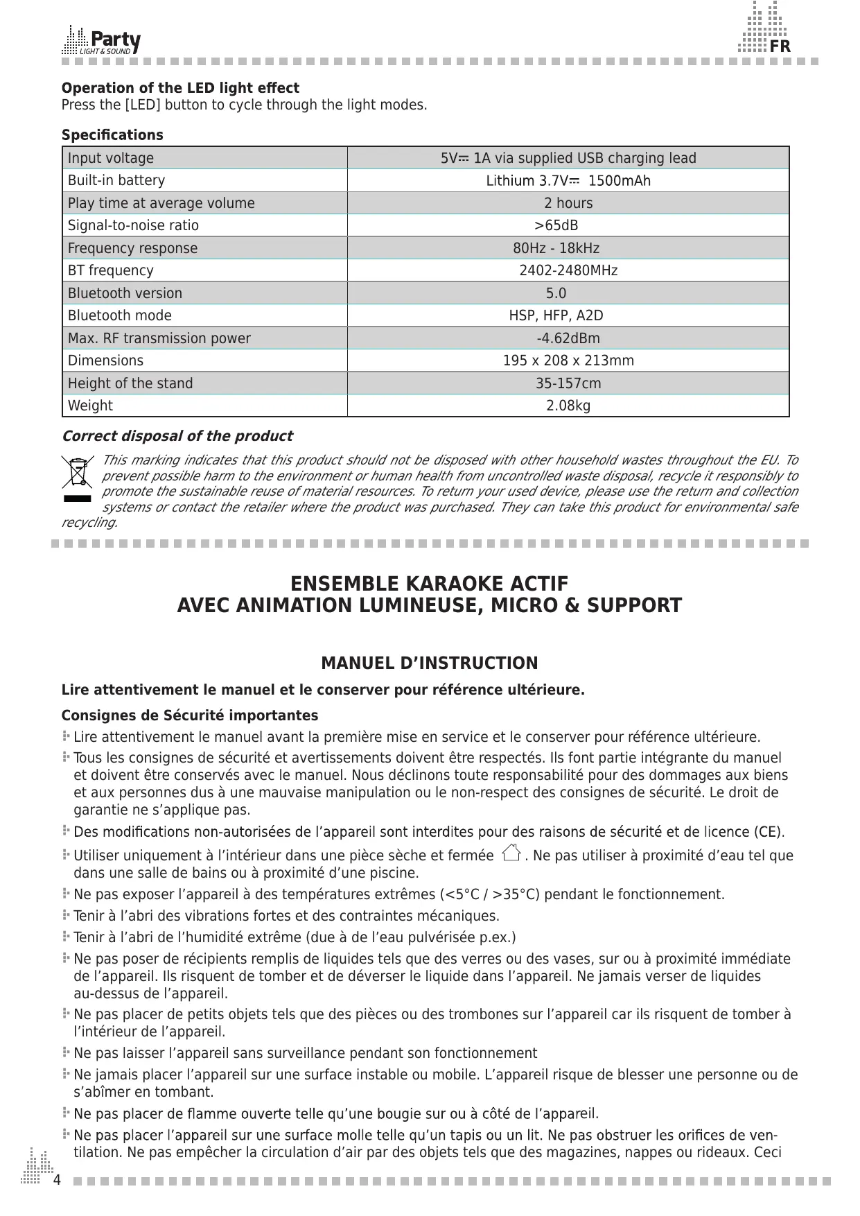 ENSEMBLE KARAOKE ACTIF AVEC ANIMATION LUMINEUSE, MICRO & SUPPORT MANUEL D’INSTRUCTION Lire attentivement le manuel et le conserver pour référence ultérieure.