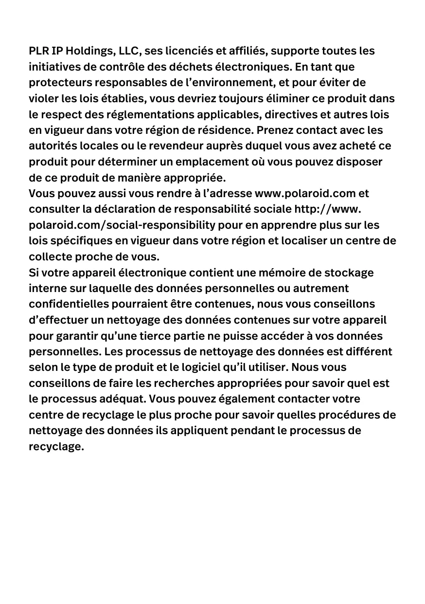 PLR IP Holdings, LLC, ses licenciés et affiliés, supporte toutes les initiatives de contrôle des déchets électroniques. En tant que protecteurs responsables de l’environnement, et pour éviter de violer les lois établies, vous devriez toujours éliminer ce produit dans le respect des réglementations applicables, directives et autres lois en vigueur dans votre région de résidence. Prenez contact avec les autorités locales ou le revendeur auprès duquel vous avez acheté ce produit pour déterminer un emplacement où vous pouvez disposer de ce produit de manière appropriée. Vous pouvez aussi vous rendre à l'adresse www.polaroid.com et consulter la déclaration de responsabilité sociale http://www. polaroid.com/social-responsibility pour en apprendre plus sur les lois spécifiques en vigueur dans votre région et localiser un centre de collecte proche de vous. Si votre appareil électronique contient une mémoire de stockage interne sur laquelle des données personnelles ou autrement confidentielles pourraient être contenues, nous vous conseillons d'effectuer un nettoyage des données contenues sur votre appareil pour garantir qu’une tierce partie ne puisse accéder à vos données personnelles. Les processus de nettoyage des données est différent selon le type de produit et le logiciel qu’il utiliser. Nous vous conseillons de faire les recherches appropriées pour savoir quel est le processus adéquat. Vous pouvez également contacter votre centre de recyclage le plus proche pour savoir quelles procédures de nettoyage des données ils appliquent pendant le processus de recyclage.