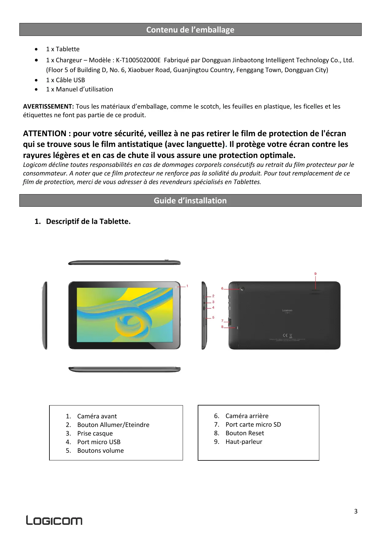 Retrouvez gratuitement la notice de l'appareil La Tab 292 2/16 GO NOIRE LOGICOM au format PDF.