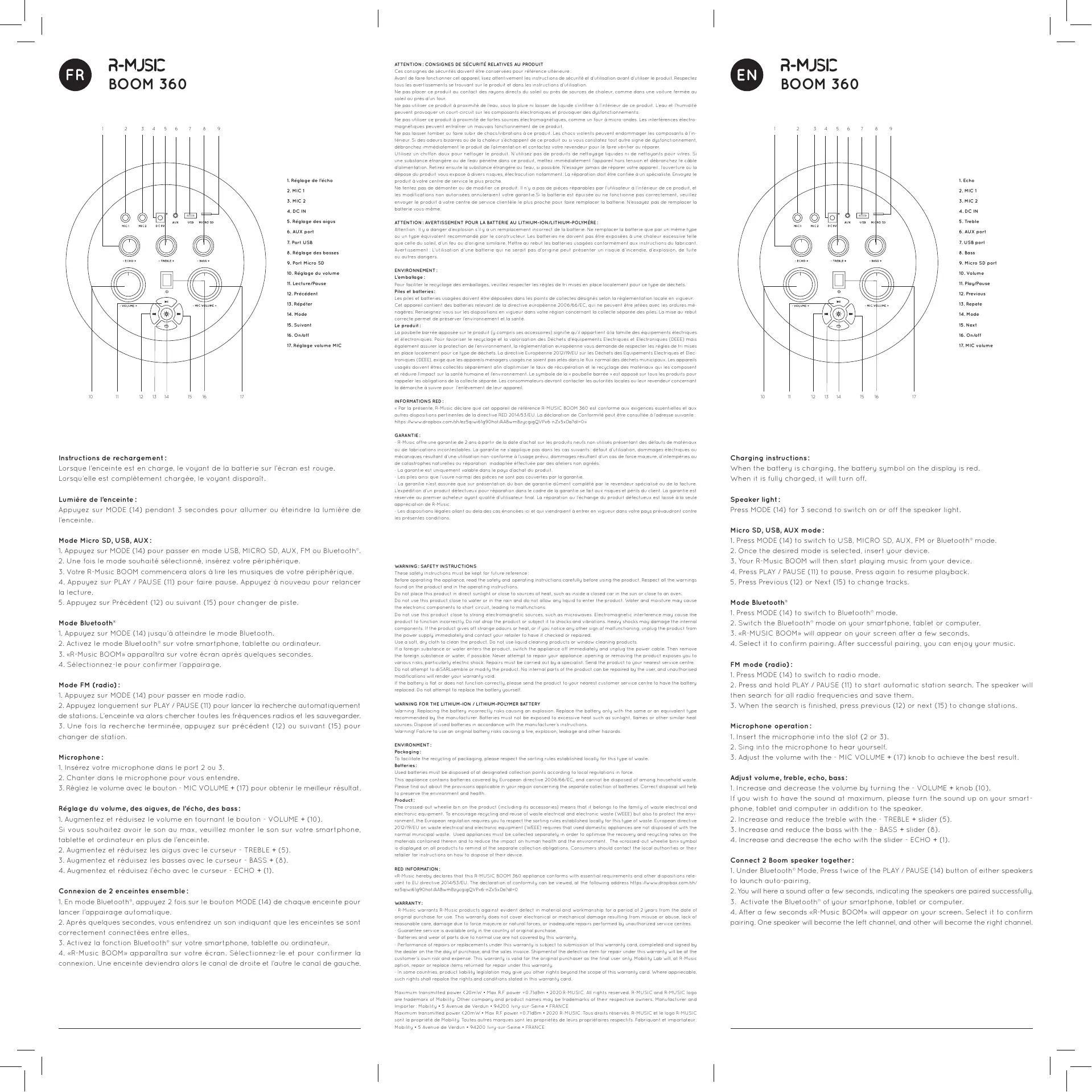 R-MJSE BOOM 360 Instructions de rechargement: Lorsque l'enceinte est en charge, le voyant de la batterie sur l'écran est rouge. Lorsqu'elle est complètement chargée, le voyant disparait Lumière de l'enceinte Appuyez sur MODE (14) pendant 3 secondes pour allumer ou éteindre la lumière de l'enceinte. Mode Micro SD, USB, AUX: T Appuyez sur MODE (14) pour passer en mode USB, MICRO SD, AUX, FM ou Bluetooth