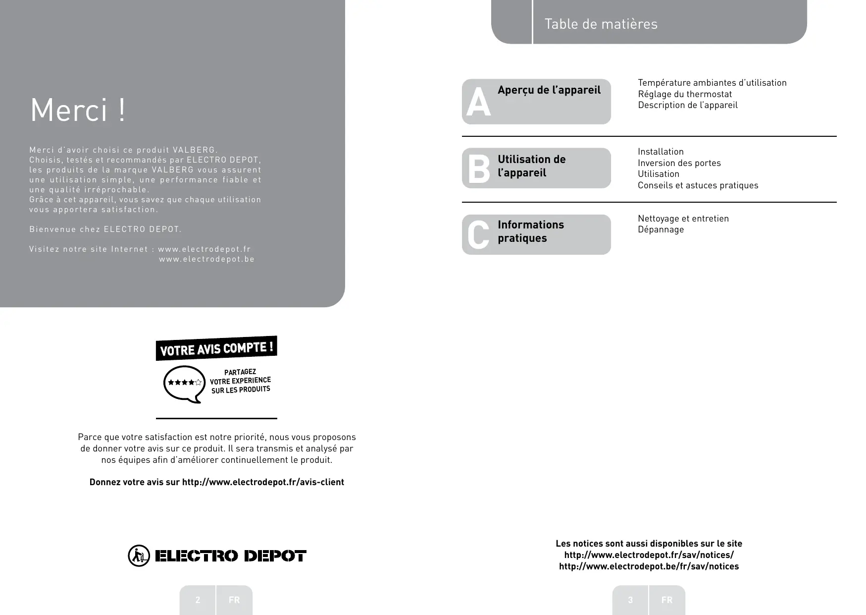 Table de matières Température ambiantes d'utilisation - Aperçu de l'appareil Réglage du thermostat M e rc | | Description de l'appareil Merci d'avoir choisi ce produit VALBERG. un Installation Choisis, testés et recommandés par ELECTRO DEPOT, Utilisation de Inversion des portes Utilisation Conseils et astuces pratiques les produits de La marque VALBERG vous assurent v ml une utilisation simple, une performance fiable et appare une qualité irréprochabl Grâce à cet appareil, vous savez que chaque uti vous apportera satisfaction. A Nettoyage et entretien Bienvenue chez ELECTRO DEPOT. Informations Dépannage pratiques Visitez notre site Internet : www.electrodepot.fr www.electrodepot.be VOTRE AVIS COMPTE ! PARTAGEZ VOTRE EXPERIENCE