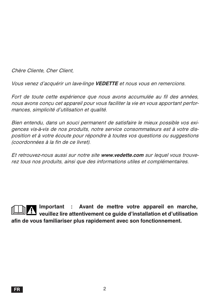 Chère Cliente, Cher Client, Vous venez d'acquérir un lave-linge VEDETTE et nous vous en remercions. Fort de toute cette expérience que nous avons accumulée au fil des années, nous avons conçu cet appareil pour vous faciliter la vie en vous apportant perfor- mances, simplicité d'utilisation et qualité. Bien entendu, dans un souci permanent de satisfaire le mieux possible vos exi- gences vis-à-vis de nos produits, notre service consommateurs est à votre dis- position et à votre écoute pour répondre à toutes vos questions ou suggestions (coordonnées à la fin de ce livret). Et retrouvez-nous aussi sur notre site www.vedette.com sur lequel vous trouve- rez tous nos produits, ainsi que des informations utiles et complémentaires. Important : Avant de mettre votre appareil en marche, veuillez lire attentivement ce guide d'installation et d'utilisation afin de vous familiariser plus rapidement avec son fonctionnement.