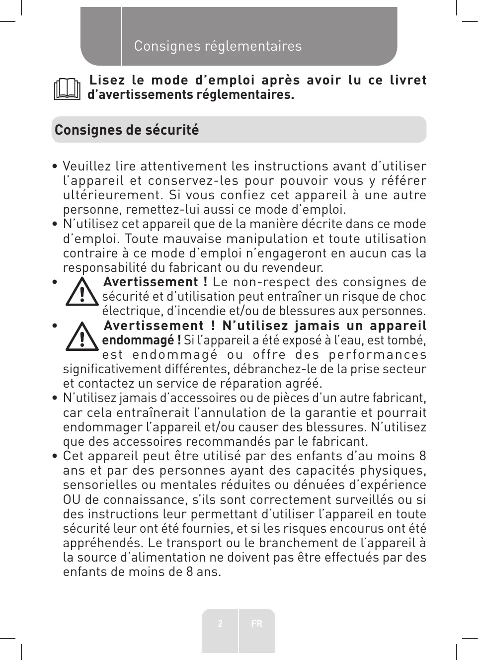 . Avertissement ! Le non-respect des consignes de sécurité et d'utilisation peut entraîner un risque de choc électrique, d'incendie et/ou de blessures aux personnes.