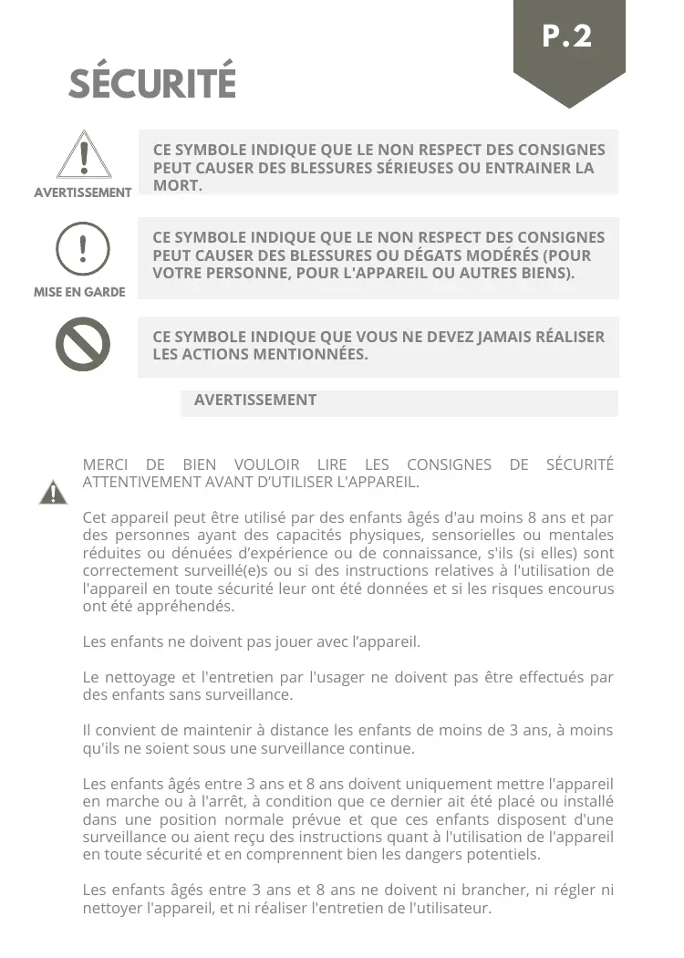 CE SYMBOLE INDIQUE QUE VOUS NE DEVEZ JAMAIS RÉALISER LES ACTIONS MENTIONNÉES. AVERTISSEMENT MERCI DE BIEN VOULOIR LIRE LES CONSIGNES DE SÉCURITÉ û ATTENTIVEMENT AVANT D'UTILISER L'APPAREIL. Cet appareil peut être utilisé par des enfants âgés d'au moins 8 ans et par des personnes ayant des capacités physiques, sensorielles ou mentales réduites ou dénuées d'expérience ou de connaissance, s'ils (si elles) sont correctement surveillé(e)s ou si des instructions relatives à l'utilisation de l'appareil en toute sécurité leur ont été données et si les risques encourus ont été appréhendés. Les enfants ne doivent pas jouer avec l'appareil. Le nettoyage et l'entretien par l'usager ne doivent pas être effectués par des enfants sans surveillance Il convient de maintenir à distance les enfants de moins de 3 ans, à moins qu'ils ne soient sous une surveillance continue. Les enfants âgés entre 3 ans et 8 ans doivent uniquement mettre l'appareil en marche ou à l'arrêt, à condition que ce dernier ait été placé ou installé dans une position normale prévue et que ces enfants disposent d'une surveillance ou aient reçu des instructions quant à l'utilisation de l'appareil en toute sécurité et en comprennent bien les dangers potentiels. Les enfants âgés entre 3 ans et 8 ans ne doivent ni brancher, ni régler ni nettoyer l'appareil, et ni réaliser l'entretien de l'utilisateur.