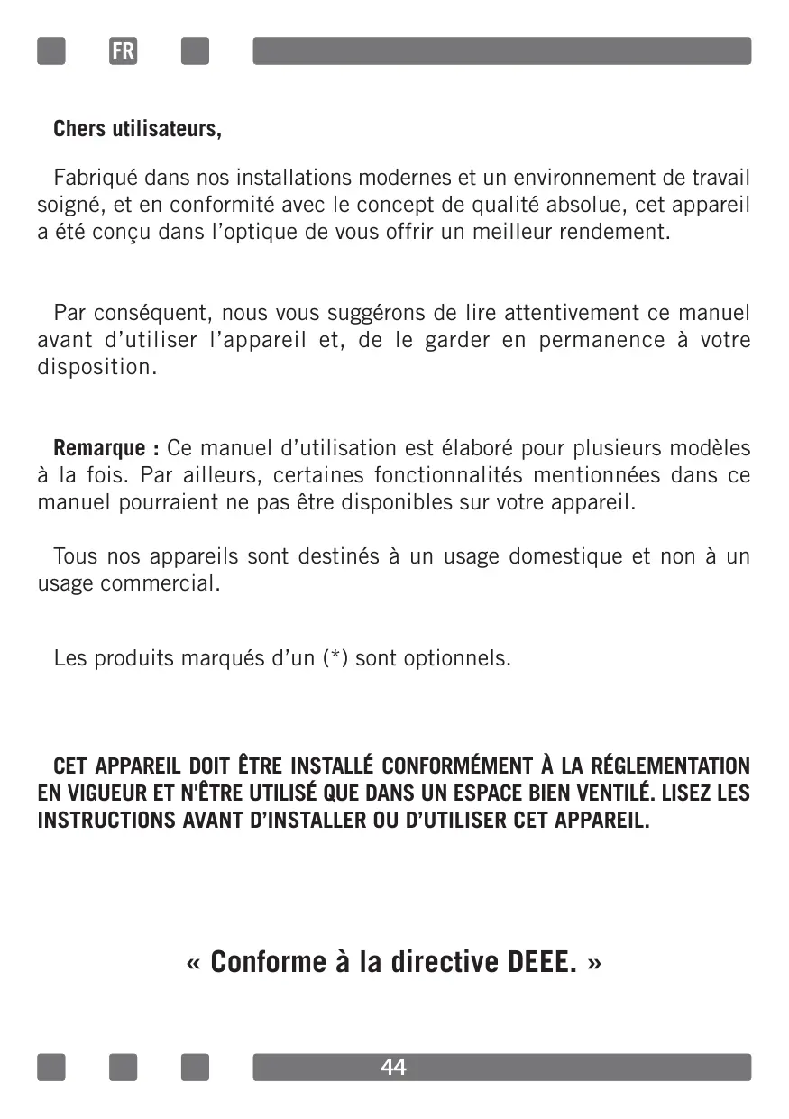 Chers utilisateurs, Fabriqué dans nos installations modernes et un environnement de travail soigné, et en conformité avec le concept de qualité absolue, cet appareil a été conçu dans l'optique de vous offrir un meilleur rendement. Par conséquent, nous vous suggérons de lire attentivement ce manuel avant d'utiliser l'appareil et, de le garder en permanence à votre disposition. Remarque : Ce manuel d'utilisation est élaboré pour plusieurs modèles à la fois. Par ailleurs, certaines fonctionnalités mentionnées dans ce manuel pourraient ne pas être disponibles sur votre appareil. Tous nos appareils sont destinés à un usage domestique et non à un usage commercial. Les produits marqués d’un (*) sont optionnels. CET APPAREIL DOIT ÊTRE INSTALLÉ CONFORMÉMENT À LA RÉGLEMENTATION EN VIGUEUR ET N'ÊTRE UTILISÉ QUE DANS UN ESPACE BIEN VENTILÉ. LISEZ LES INSTRUCTIONS AVANT D'INSTALLER OU D'UTILISER CET APPAREIL. « Conforme à la directive DEEE. »