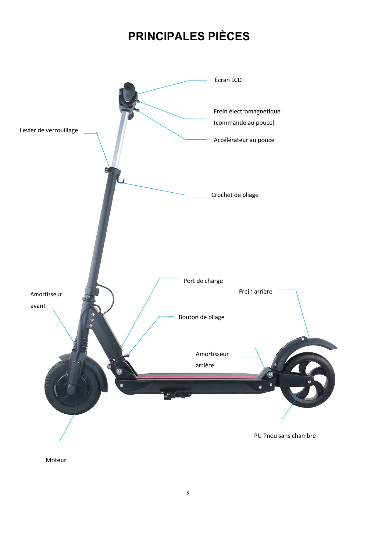 ———— Écran LCD Frein électromagnétique (commande au pouce) Levier de verrouillage Accélérateur au pouce Crochet de pliage Port de charge Frein arrière Amortisseur avant Bouton de pliage Amortisseur arrière PU Pneu sans chambre Moteur