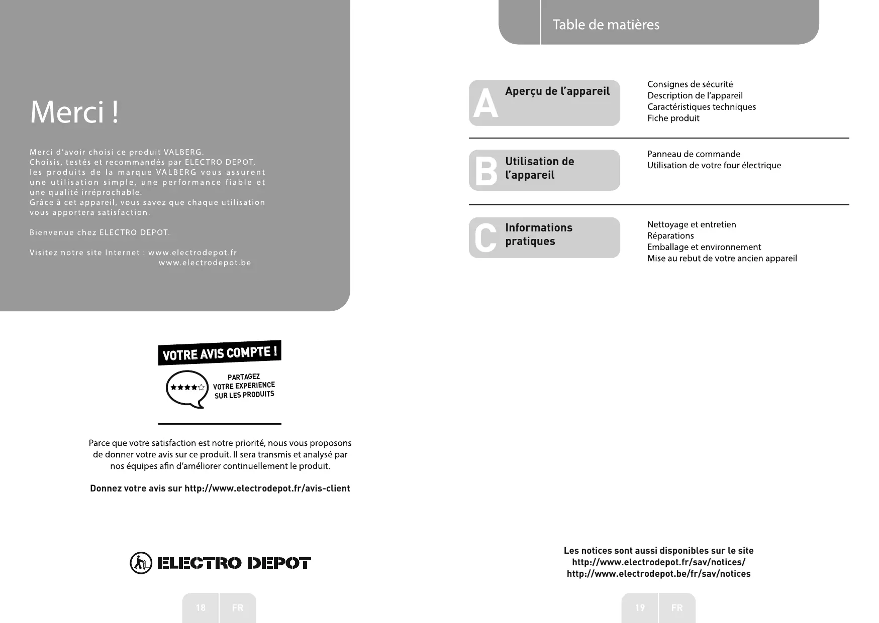 Grâce à cet appareil, vous savez que chaque utilisation vous apportera satisfaction Informations Nettoyage et entretien Bienvenue chez ELECTRO DEPOT. l Réparations . ._ pratiques Emballage et environnement Visitez notre site Internet : www.electrodepot.fr : www.electrodepot.be Mise au rebut de votre ancien appareil