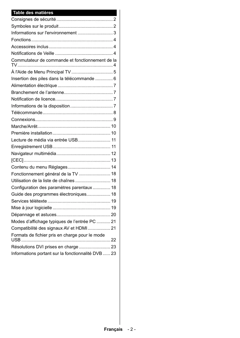 Remarque: Les options d'Économie d'énergie disponibles peuvent varier en fonction du Mode sélectionné dans le menu Paramètres>Image. Vous pouvez accéder aux paramètres d'Économie d'énergie dans le menu Paramètres>Image. Sachez que les réglages de certaines images ne pourront pas être accessibles pour modification Si vous appuyez sur le bouton de droite ou de gauche consécutivement, “L'écran s'éteint au bout de 15 secondes.” et un message s'affiche à l'écran Sélectionnez Continuer et appuyez sur OK pour éteindre immédiatement l'écran. Si vous n'appuyez sur aucun bouton, l'écran va s'éteindre après 15 secondes. Appuyez sur n'importe quelle touche de la télécommande ou sur le téléviseur pour allumer l'écran à nouveau Remarque: L'option d'Extinction d' lorsque le mode Jeu est activé. ran n'est pas disponible Veuillez mettre le téléviseur hors tension et le débrancher du secteur lorsque vous ne vous en servez pas. Cela permettra également de réduire la consommation d'énergie Fonctions + TV couleur avec télécommande + TV numérique / par câble entièrement intégrée (OVB-T2/C) + Entrées HDMI pour connecter d'autres appareils aux prises HDMI + Entrée USB + Système de menu OSD + Prise péritel pour appareils externes (appareil vidéo, jeu vidéo, appareil audio, etc.) + Système de son stéréo + Télétexte + Connexion de casque + Système de programmation automatique + Réglage manuel + L'arrêt est automatique après plus de huit heures de temps + Minuteur de mise en veille + Verrouillage enfants + Coupure automatique du son en l'absence de transmission. + Lecture NTSC + AVL (Limitation automatique du volume) + PLL (Recherche de fréquences) + Entrée PC + Mode Jeu (en option) + Fonction de coupure de l'image + Enregistrement de programme Français + Décalage de programme Accessoires inclus + Télécommande + Piles : 2 x AAA + Manuel d'instructions Notifications de Veille Lorsque le téléviseur ne reçoit aucun signal d'entrée {par exemple une antenne ou une source HDMI) pendant 3 minutes, il passe en veille. Lors de la prochaine mise en marche, le message suivant s'affiche à l'écran : « Le téléviseur passe automatiquement en mode veille parce qu'il ne reçoit aucun signal après un long moment. » L'option Auto TV OFF (dans le menu Réglages> Système> Plus) a pu être réglée sur une valeur comprise entre 1 et 8 heures par défaut. Si ce paramètre n'est pas réglé sur Désactivé et le téléviseur estresté allumé sans toutefois fonctionner pendant la période définie, il passera en mode Veille à l'expiration de ce délai. Au prochain démarrage du téléviseur, le message suivant s'affichera.« La télé passe automatiquement en mode veille parce qu'aucun nal n'a été reçu après un long moment. » Avant que le téléviseur ne passe en mode veille, une fenêtre de dialogue s'affiche. Si vous n'appuyez sur aucune touche, le téléviseur passe en mode veille après une période d'attente d'environ 5 minutes. Vous pouvez mettre Oui en surbrillance et appuyer sur OK pour mettre immédiatement le téléviseur en mode veille. Si vous sélectionnez Non et appuyez sur OK, le téléviseur reste allumé. Vous pouvez également choisir d'annuler la fonction Auto TV OFF à partir de cette boîte de dialogue. Sélectionnez Désactiver et appuyez sur OK, le téléviseur reste allumé et la fonction est annulée. Vous pouvez réactiver cette fonction en modifiant le réglage de l'option Auto TV OFF à partir du menu Paramètres>Système>Plus. Commutateur de commande et fonctionnement de la TV ÿ-0