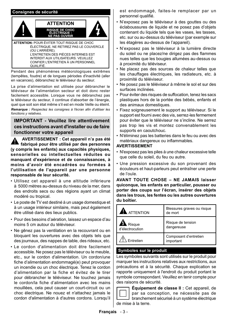 fabriqué pour être utilisé par des personnes {y compris les enfants) aux capacités physiques, sensorielles ou intellectuelles réduites ou manquant d'expérience et de connaissances, à moins d’avoir été encadrées ou formées à l'utilisation de l'appareil par une personne responsable de leur sécurité. + Utilisez cet appareil à une altitude inférieure à 5000 mètres au-dessus du niveau de la mer, dans des endroits secs ou des régions ayant un climat modéré ou tropical + Le poste de TV est destiné à un usage domestique et à un usage intérieur similaire, mais peut également être utilisé dans des lieux publics. + Pour des besoins d'aération, laissez un espace d'au moins 5 cm autour du téléviseur. + Ne gênez pas la ventilation en la recouvrant ou en bloquant les ouvertures avec des objets tels que des journaux, des nappes de table, des rideaux, etc. + Le cordon d'alimentation doit être facilement accessible. Ne posez pas le téléviseur ou le meuble, etc.. sur le cordon d'alimentation. Un cordon/une fiche d'alimentation endommagé (e) peut provoquer un incendie ou un choc électrique. Tenez le cordon d'alimentation par la fiche et évitez de le tirer pour débrancher le téléviseur. Ne touchez jamais le cordon/la fiche d'alimentation avec les mains mouillées, cela peut causer un court-circuit ou un choc électrique. Ne nouez et n'attachez jamais le cordon d'alimentation à d'autres cordons. Lorsqu'il est endommagé, faites-le remplacer par un personnel qualifié + N'exposez pas le téléviseur à des gouttes ou des éclaboussures de liquide et ne posez pas d'objets contenant du liquide tels que les vases, les tasses, etc. sur ou au-dessus du téléviseur (par exemple sur les étagères au-dessus de l'appareil) N'exposez pas le téléviseur à la lumière directe du soleil ou ne placez/ne dirigez pas des flammes nues telles que les bougies allumées au-dessus ou à proximité du téléviseur. + Ne placez pas des sources de chaleur telles que les chauffages électriques, les radiateurs, etc. à proximité du téléviseur. + Ne posez pas le téléviseur à même le sol et sur des surfaces inclinées. Pour éviter des risques de suffocation, tenez les sacs plastiques hors de la portée des bébés, enfants et des animaux domestiques. + Fixez soigneusement le support au téléviseur. Si le support est fourni avec des vis, serrez-les fermement pour éviter que le téléviseur ne s'incline. Ne serez pas trop les vis et montez convenablement les supports en caoutchouc. + N'éliminez pas les batteries dans le feu ou avec des matériaux dangereux ou inflammables. AVERTISSEMENT + N'exposez pas les piles à une chaleur excessive telle que celle du soleil, du feu ou autre. + Une pression excessive du son provenant des écouteurs et haut-parleurs peut entraîner une perte de l'ouïe. AVANT TOUTE CHOSE - NE JAMAIS laisser quiconque, les enfants en particulier, pousser ou porter des coups sur l'écran, insérer des objets dans les trous, les fentes ou les autres ouvertures du boîtier. A rrenron À noue d'électrocution Composant d'entretien ZA Entretien important Symboles sur le produit Les symboles suivants sont utilisés sur le produit pour marquer les instructions relatives aux restrictions, aux précautions et à la sécurité. Chaque explication se rapporte uniquement à l'endroit du produit portant le symbole correspondant. Veuillez en tenir compte pour des raisons de sécurité. Équipement de classe Il : Cet appareil, de [] | par sa conception, ne nécessite pas de de mise à la terre Blessures graves ou risque de mort Risque de tension dangereuse branchement sécurisé à un système électrique Français -3-