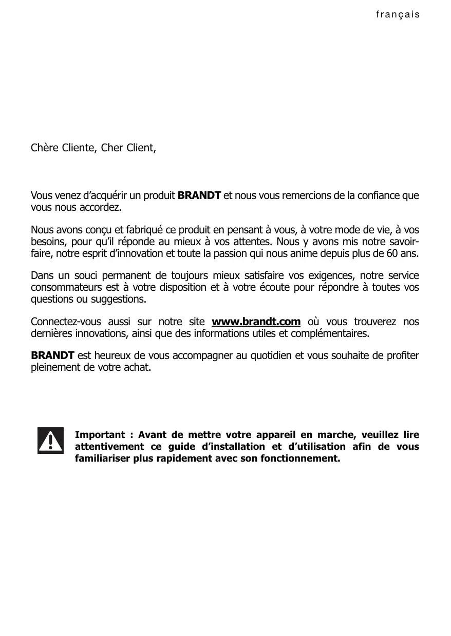 Vou venez d'acquerir un produit BRANDT et nous vous remercions de la confiance que vous nous accordez.