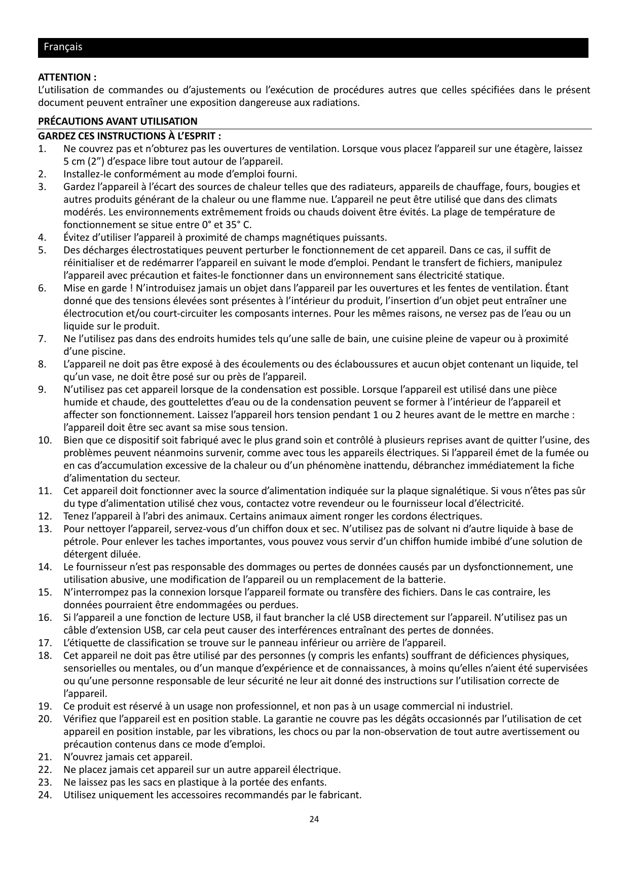 Ne couvrez pas et n’obturez pas les ouvertures de ventilation. Lorsque vous placez l'appareil sur une étagère, laissez 5 cm (2”) d'espace libre tout autour de l'appareil. Installez-le conformément au mode d'emploi fourni. Gardez l'appareil à l'écart des sources de chaleur telles que des radiateurs, appareils de chauffage, fours, bougies et autres produits générant de la chaleur où une flamme nue. L'appareil ne peut être utilisé que dans des climats modérés. Les environnements extrêmement froids ou chauds doivent être évités. La plage de température de fonctionnement se situe entre 0° et 35° C. Évitez d'utiliser l'appareil à proximité de champs magnétiques puissants. Des décharges électrostatiques peuvent perturber le fonctionnement de cet appareil. Dans ce cas, il suffit de réinitialiser et de redémarrer l'appareil en suivant le mode d'emploi. Pendant le transfert de fichiers, manipulez l'appareil avec précaution et faites-le fonctionner dans un environnement sans électricité statique. Mise en garde ! N’introduisez jamais un objet dans l'appareil par les ouvertures et les fentes de ventilation. Étant donné que des tensions élevées sont présentes à l’intérieur du produit, l'insertion d’un objet peut entraîner une électrocution et/ou court-circuiter les composants internes. Pour les mêmes raisons, ne versez pas de l’eau ou un liquide sur le produit. Ne l’utilisez pas dans des endroits humides tels qu’une salle de bain, une cuisine pleine de vapeur ou à proximité d’une piscine. L'appareil ne doit pas être exposé à des écoulements ou des éclaboussures et aucun objet contenant un liquide, tel qu’un vase, ne doit être posé sur ou près de l'appareil. N'utilisez pas cet appareil lorsque de la condensation est possible. Lorsque l’appareil est utilisé dans une pièce humide et chaude, des gouttelettes d’eau ou de la condensation peuvent se former à l’intérieur de l’appareil et affecter son fonctionnement. Laissez l'appareil hors tension pendant 1 ou 2 heures avant de le mettre en marche : l'appareil doit être sec avant sa mise sous tension. Bien que ce dispositif soit fabriqué avec le plus grand soin et contrôlé à plusieurs reprises avant de quitter l’usine, des problèmes peuvent néanmoins survenir, comme avec tous les appareils électriques. Si l'appareil émet de la fumée ou en cas d’accumulation excessive de la chaleur ou d’un phénomène inattendu, débranchez immédiatement la fiche d'alimentation du secteur. Cet appareil doit fonctionner avec la source d'alimentation indiquée sur la plaque signalétique. Si vous n'êtes pas sûr du type d'alimentation utilisé chez vous, contactez votre revendeur ou le fournisseur local d'électricité Tenez l'appareil à l'abri des animaux. Certains animaux aiment ronger les cordons électriques. Pour nettoyer l'appareil, servez-vous d’un chiffon doux et sec. N'utilisez pas de solvant ni d’autre liquide à base de pétrole. Pour enlever les taches importantes, vous pouvez vous servir d’un chiffon humide imbibé d’une solution de détergent diluée. Le fournisseur n’est pas responsable des dommages ou pertes de données causés par un dysfonctionnement, une utilisation abusive, une modification de l'appareil ou un remplacement de la batterie. N’interrompez pas la connexion lorsque l'appareil formate ou transfère des fichiers. Dans le cas contraire, les données pourraient être endommagées ou perdues. Si l'appareil a une fonction de lecture USB, il faut brancher la clé USB directement sur l'appareil. N'utilisez pas un câble d'extension USB, car cela peut causer des interférences entraînant des pertes de données. L'étiquette de classification se trouve sur le panneau inférieur ou arrière de l'appareil. Cet appareil ne doit pas être utilisé par des personnes (y compris les enfants) souffrant de déficiences physiques, sensorielles ou mentales, ou d’un manque d’expérience et de connaissances, à moins qu’elles n'aient été supervisées où qu’une personne responsable de leur sécurité ne leur ait donné des instructions sur l’utilisation correcte de l'appareil. Ce produit est réservé à un usage non professionnel, et non pas à un usage commercial ni industriel. Vérifiez que l'appareil est en position stable. La garantie ne couvre pas les dégâts occasionnés par l’utilisation de cet appareil en position instable, par les vibrations, les chocs ou par la non-observation de tout autre avertissement ou précaution contenus dans ce mode d'emploi. N'ouvrez jamais cet appareil. Ne placez jamais cet appareil sur un autre appareil électrique. Ne laissez pas les sacs en plastique à la portée des enfants. Utilisez uniquement les accessoires recommandés par le fabricant.