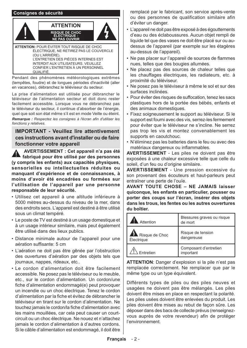 NE PAS OUVRIR ATTENTION: POUR ÉVITER TOUT RISQUE DE CHOC ÉLECTRIQUE, NE RETIREZ PAS LE COUVERCLE (OU L'ARRIÈRE) L'ENTRETIEN DES PIÈCES INTERNES EST INTERDIT AUX UTILISATEURS. VEUILLEZ CONFIER L'ENTRETIEN À UN PERSONNEL QUALIFIÉ. Pendant des phénomènes météorologiques extrêmes (tempêtes, foudre) et de longues périodes d'inactivité (aller en vacances), débranchez le téléviseur du secteur. La prise d'alimentation est utilisée pour débrancher le téléviseur de l'alimentation secteur et doit donc rester facilement accessible. Lorsque vous ne débranchez pas le téléviseur du secteur, il continue d'absorber de l'énergie quel que soit son état même s’il est en mode Veille ou éteint Remarque : Respectez les consignes à l'écran afin d'utiliser les fonctions y relatives.