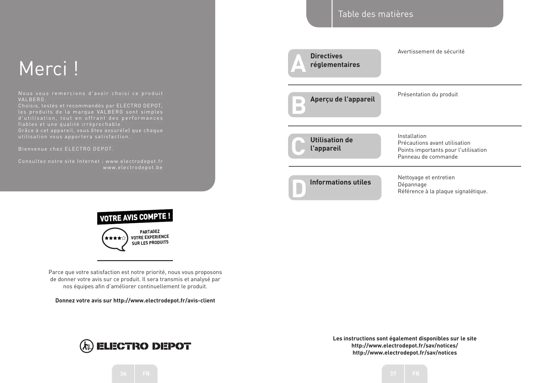 Parce que votre satisfaction est notre priorité, nous vous proposons de donner votre avis sur ce produit. IL sera transmis et analysé par nos équipes afin d'améliorer continuellement Le produit. Donnez votre avis sur http://www.electrodepot.fr/avis-client Les instructions sont également disponibles sur Le site ® E http://www.electrodepot.fr/sav/notices/ http://www.electrodepot.fr/sav/notices