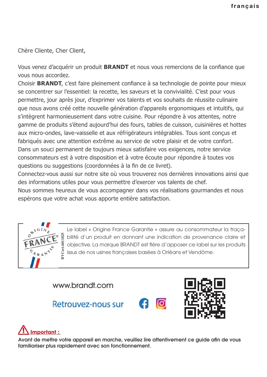 Vou venez d'acquerir un produit BRANDT et nous vous remercions de la confiance que vous nous accordez.