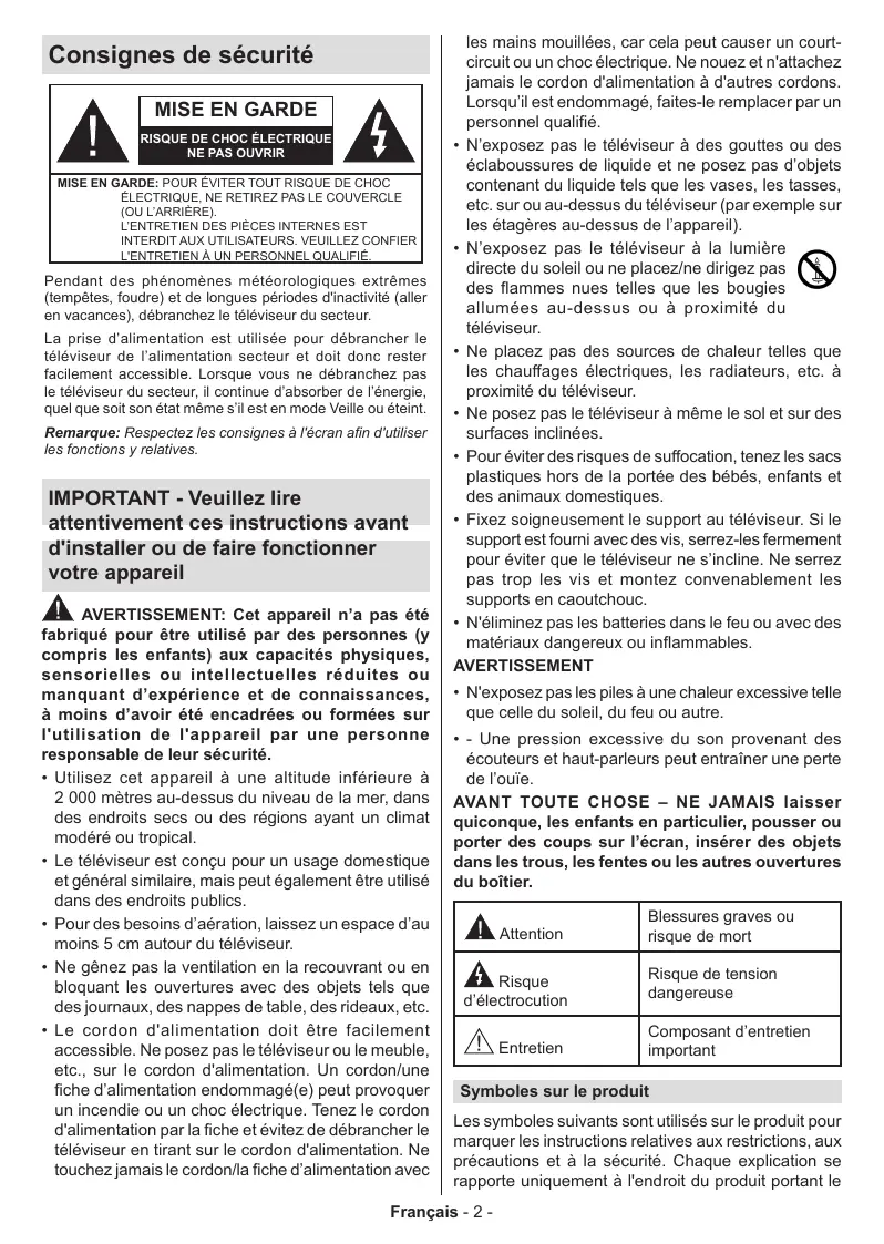+ TOUJOURS utiliser les armoires ou les supports ou les méthodes de montage recommandées par le fabricant du téléviseur.