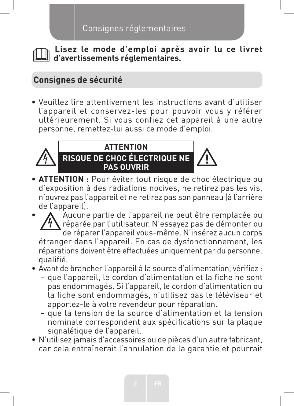 Consignes réglementaires [1 Lisez Le mode d'emploi après avoir Lu ce livret d’avertissements réglementaires. Consignes de sécurité + Veuillez lire attentivement Les instructions avant d'utiliser l'appareil et conservez-les pour pouvoir vous y référer ultérieurement. Si vous confiez cet appareil à une autre personne, remettez-lui aussi ce mode d'emploi. ATTENTION PA RISQUE DE CHOC ÉLECTRIQUE NE A PAS OUVRIR + ATTENTION : Pour éviter tout risque de choc électrique ou d'exposition à des radiations nocives, ne retirez pas les vis, n'ouvrez pas l'appareil et ne retirez pas son panneau (à l'arrière de l'appareil). . Aucune partie de l'appareil ne peut être remplacée où réparée par l'utilisateur. N'essayez pas de démonter ou de réparer l'appareil vous-même. N'insérez aucun corps étranger dans l'appareil. En cas de dysfonctionnement, les réparations doivent être effectuées uniquement par du personnel qualifié. + Avant de brancher l'appareil à La source d'alimentation, vérifiez : - que l'appareil, Le cordon d'alimentation et la fiche ne sont pas endommagés. Si l'appareil, Le cordon d'alimentation ou la fiche sont endommagés, n'utilisez pas le téléviseur et apportez-le à votre revendeur pour réparation. - que La tension de la source d'alimentation et la tension nominale correspondent aux spécifications sur la plaque signalétique de l'appareil. + N'utilisez jamais d'accessoires ou de pièces d'un autre fabricant, car cela entraînerait l'annulation de la garantie et pourrait