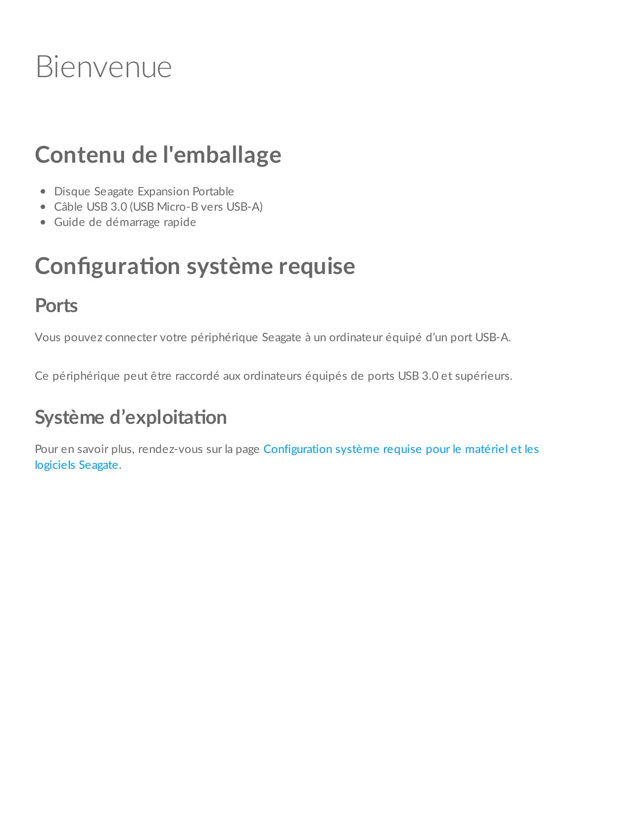 Bienvenue Contenu de l'emballage + Disque Seagate Expansion Portable + _ Câble USB 3.0 (USB Micro-B vers USB-A) + Guide de démarrage rapide Configuration système requise Ports Vous pouvez connecter votre périphérique Seagate à un ordinateur équipé d’un port USB-A. Ce périphérique peut être raccordé aux ordinateurs équipés de ports USB 3.0 et supérieurs. Système d'exploitation Pour en savoir plus, rendez-vous sur la page Configuration système requise pour le matériel et les logiciels Seagate.
