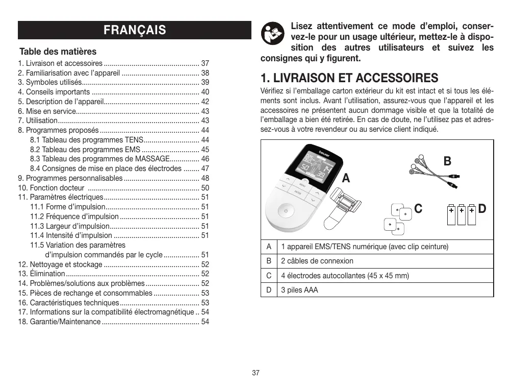 8.4 Consignes de mise en place des électrodes 9. Programmes persomalsahles . 10. Fonction docteur 11. Paramètres électriques. 15. Pièces de rechange et consommables 16. Caractéristiques techniques. 17. Informations sur la compatibilité écromagnétus . 18. Garantie/Maintenance … anne