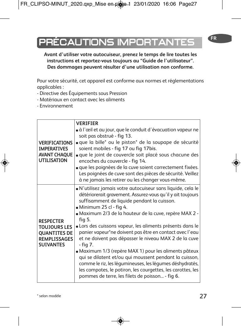 « Maximum 1/3 (repère MAX 1) pour les aliments pâteux qui se dilatent et/ou qui moussent pendant la cuisson, comme le riz, les légumineuses, les légumes déshydratés, les compotes, le potiron, les courgettes, les carottes, les pommes de terre, les filets de poisson... fig 6.