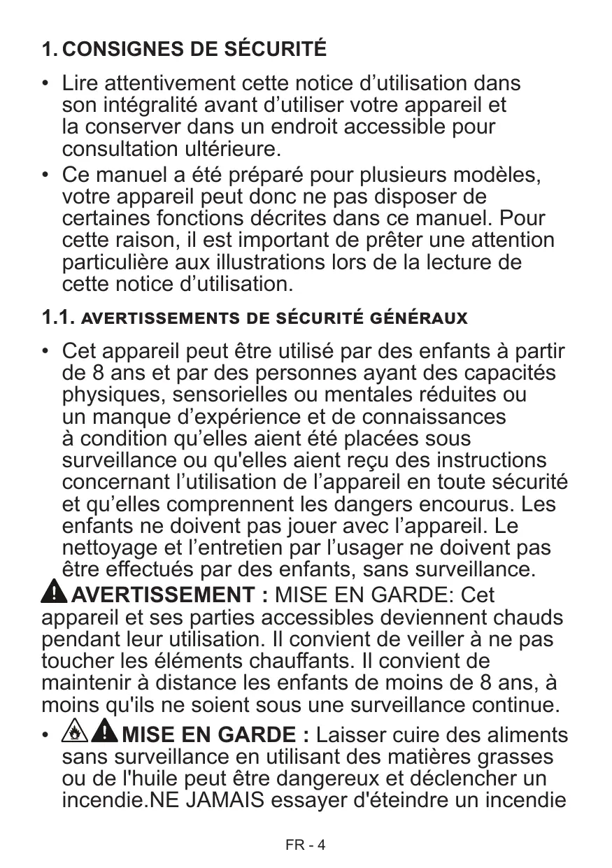 A\MISE EN GARDE : Laisser cuire des aliments sans surveillance en utilisant des matières grasses ou de l'huile peut être dangereux et déclencher un incendie. NE JAMAIS essayer d'éteindre un incendie avec de l'eau, mais arrêter l'appareil puis couvrir les flammes par exemple avec un couvercle ou une couverture anti-feu.