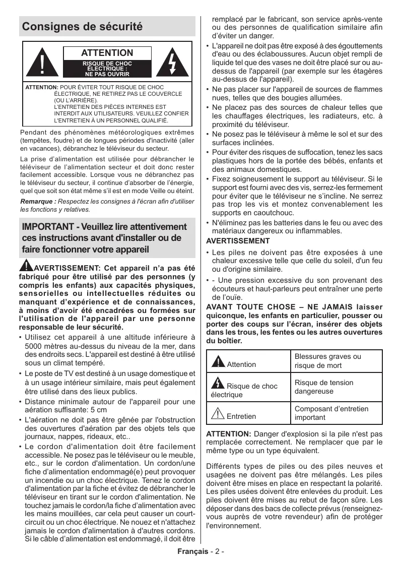 NE PAS OUVRIR ATTENTION: POUR ÉVITER TOUT RISQUE DE CHOC ÉLECTRIQUE, NE RETIREZ PAS LE COUVERCLE (OU L'ARRIÈRE). L'ENTRETIEN DES PIÈCES INTERNES EST INTERDIT AUX UTILISATEURS. VEUILLEZ CONFIER L'ENTRETIEN À UN PERSONNEL QUALIFIÉ.