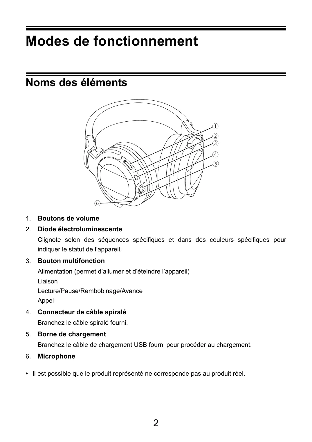 Clignote selon des séquences spécifiques et dans des couleurs spécifiques pour indiquer le statut de l'appareil. 3. Bouton multifonction Alimentation (permet d'allumer et d'éteindre l'appareil) Liaison Lecture/Pause/Rembobinage/Avance Appel 4. Connecteur de câble spirale Branchez le câble spirale fourni. 5. Borne de chargement Branchez le câble de chargement USB fourni pour charger au chargement. 6. Microphone - Il est possible que le produit représenté ne corresponde pas au produit réel.
