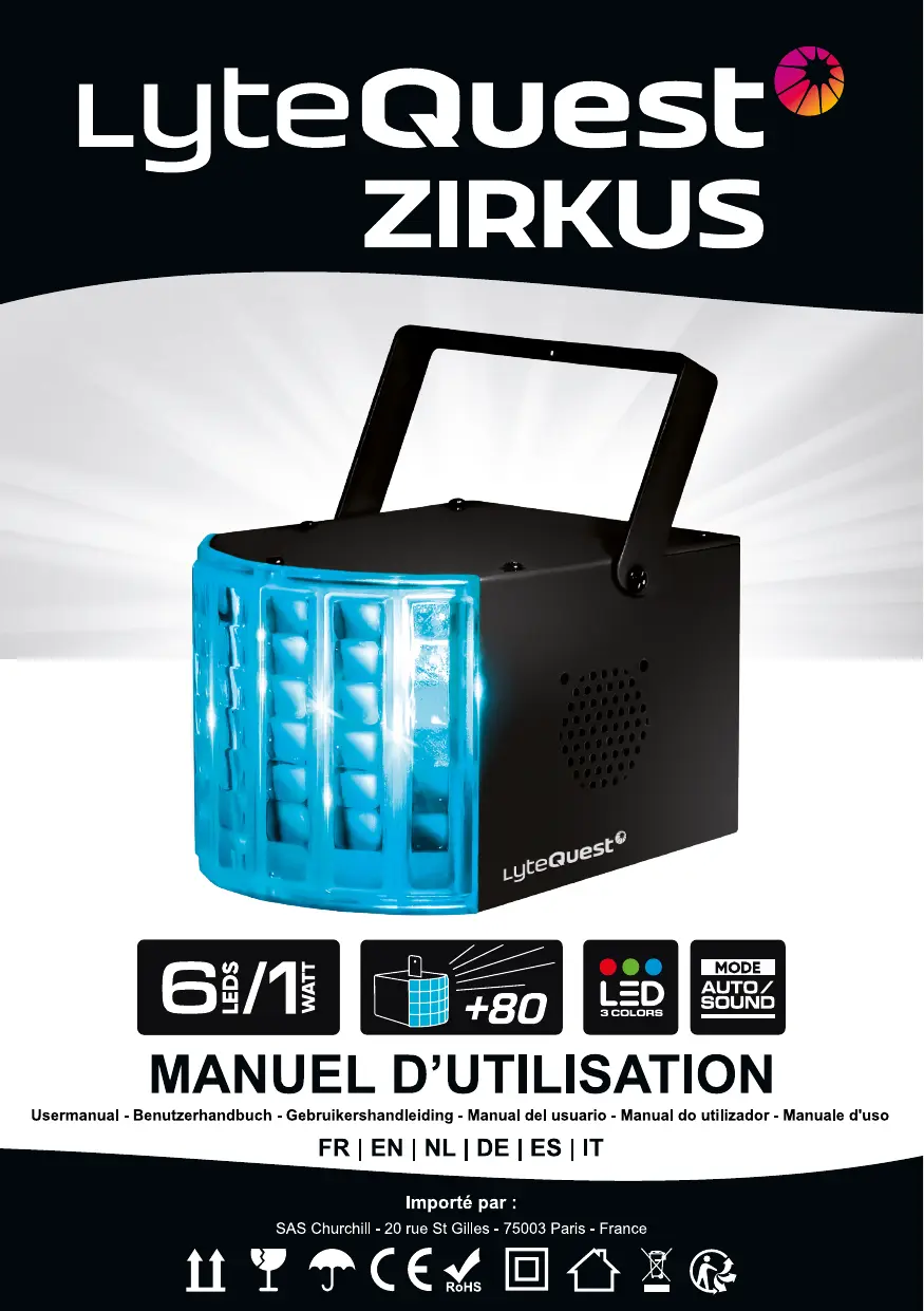 Ces symboles ne sont valides qu'au sein de l'Union Européenne: CONSIGNES D'UTILISATION : Ce produit est un éclairage équipé de lampes LED. Idéal pour un puissant éclairage à faible consommation avec position fonctionnant au rythme de la musique. L'appareil n'est prévu que pour une utilisation en intérieur. Avant toute installation, entretien et réparation, assurez-vous que l'appareil soit éteint, débranché et refroidis. DÉBALLAGE ET INSPECTION : Avant son installation et son utilisation, vérifiez si votre appareil n'est pas endommagé et s'il est complet. En cas de problème, retournez-le à votre revendeur ou service technique. Pour éviter tout risque d'accident, mettez tous les emballages hors de la portée des enfants. SUSPENSION DE L'ÉCLAIRAGE : Avant l'installation de l'appareil, assurez-vous de la stabilité et de la solidité du lieu d'installation. Vérifiez la stabilité et la sûreté de l'installation. Une mauvaise installation peut générer des risques. Le fabricant ne saurait être tenu responsable en cas de d'accident s’il y a eu une mauvaise installation Vous pouvez installer cet appareil dans n'importe quelle position pourvu qu'il y ait suffisamment d'espace pour assurer une ventilation suffisante. Il est impératif de maintenir les orifices de ventilation dégagés. CARACTÉRISTIQUES TECHNIQUES : - 6 leds 1 watt 6 couleurs rouge / vert / bleu / Blanc / jaune / violet - Mode automatique / Rythme de la musique - Plus de 80 faisceaux - 42 lentilles ASSISTANCE Si vous avez besoin d'assistance pour ce produit, vous pouvez joindre le service technique par e-mail à cette adresse : assistancelytequest.churchill world % LyteQuest