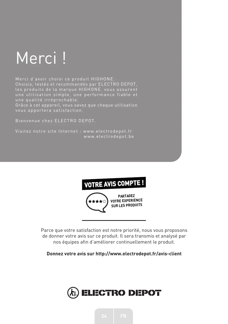 Merci | Merci d'avoir choisi ce produit HIGHONE. Choisis, testés et recommand les produits de La marque HIGHONE. une utilisation simple, une performance fiable et une qualité irréprochabl Grâce à cet appareil, vous apportera Bienvenue chez ELECTRO DEPOT. Visitez notre site Internet : www.electrodepot.fr www.electrodepot.be VOTRE AVIS COMPTE ! PARTAGEZ VOTRE EXPERIENCE