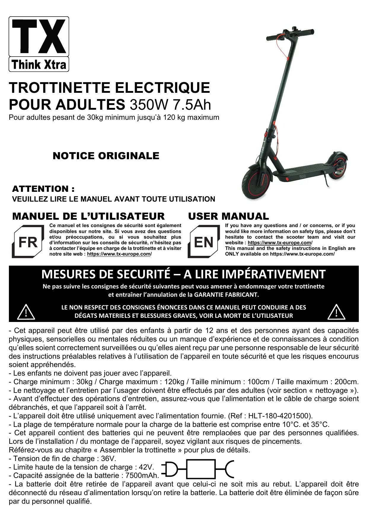 Ce manuel et les consignes de sécurité sont également disponibles sur notre site. Si vous avez des questions et/ou préoccupations, ou si vous souhaitez plus d'information sur les conseils de sécurité, n'hésitez pas à contacter l'équipe en charge de la trottinette et à visiter notre site web : https://www.tx-europe.com/