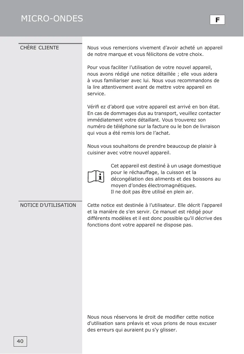 Cet appareil ménager destiné à la cuisson des aliments et des boissons fonctionne avec des ondes électromagnétiques et doit être utilisé exclusivement à l'intérieur.