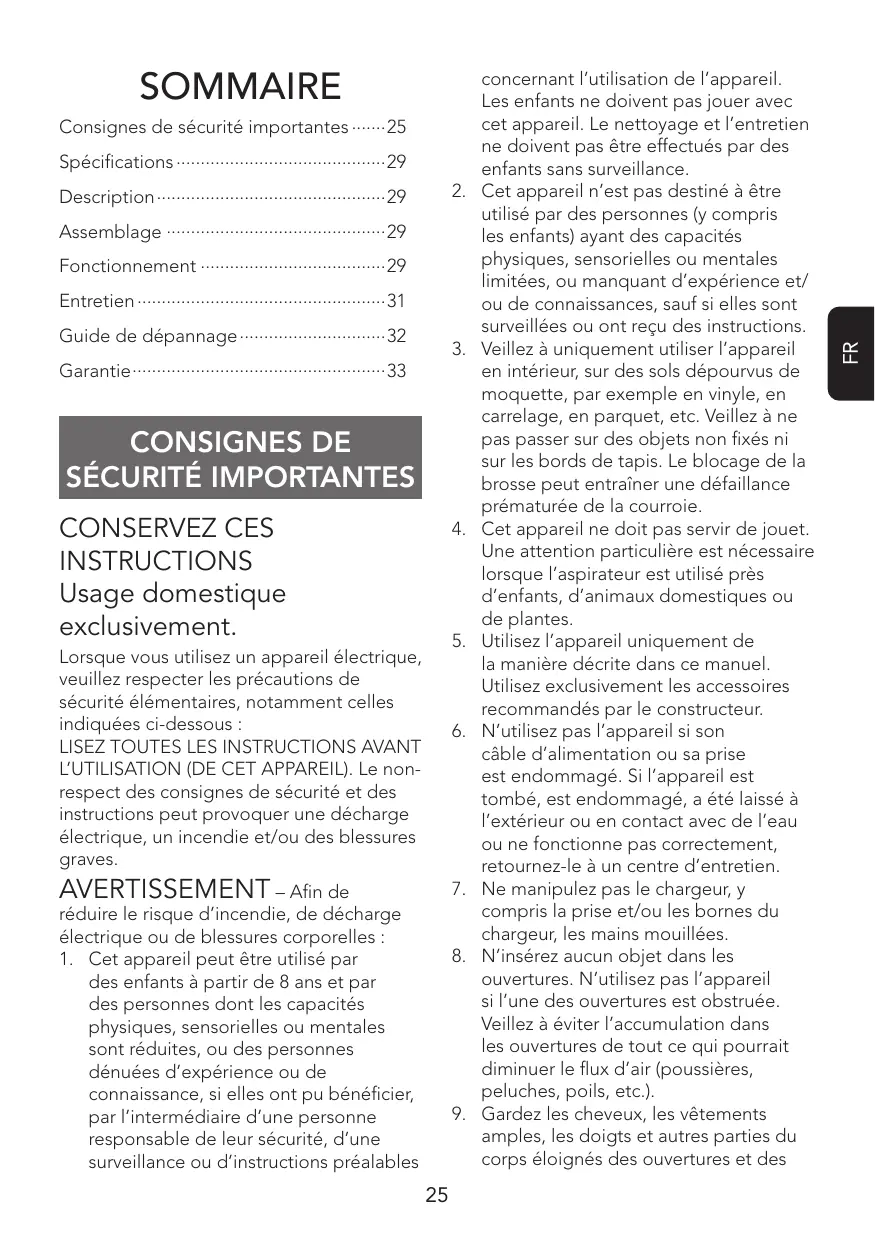 - Cet apparéil ne doit pas servir de jouet. Une attention particulière est nécessaire lorsqu'l'aspirateur est utilisé pres d'enfants, d'animaux domestiques ou de plantes.