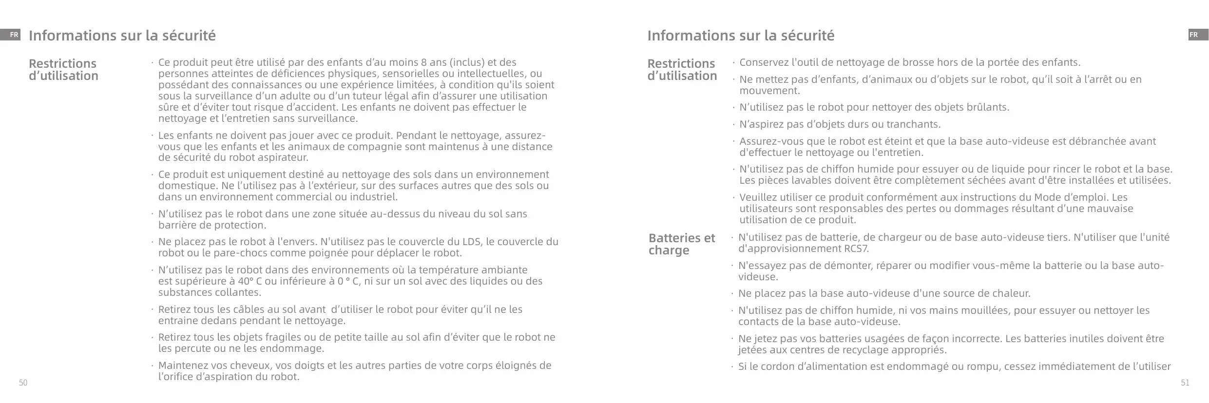 Restrictions d'utilisation - Ce produit peut être utilisé par des enfants d'au moins 8 ans (inclus) et des - Ne placez pas le robot à l'envers. N'utilisez pas Le couvercle du LDS, Le couvercle du Restrictions personnes atteintes de déficiences physiques, sensorielles ou intellectuelles, ou d'utilisation possédant des connaissances ou une expérience limitées, à condition qu'ils soient sous la surveillance d'un adulte ou d'un tuteur légal afin d'assurer une utilisation sûre et d'éviter tout risque d'accident. Les enfants ne doivent pas effectuer le nettoyage et l'entretien sans surveillance. - Les enfants ne doivent pas jouer avec ce produit. Pendant le nettoyage, assurez- vous que les enfants et les animaux de compagnie sont maintenus à une distance de sécurité du robot aspirateur. - Ce produit est uniquement destiné au nettoyage des sols dans un environnement domestique. Ne l’utilisez pas à l'extérieur, sur des surfaces autres que des sols ou dans un environnement commercial ou industriel. - N'utilisez pas le robot dans une zone située au-dessus du niveau du sol sans barrière de protection. Batteries et robot ou le pare-chocs comme poignée pour déplacer Le robot. charge - N'utilisez pas le robot dans des environnements où la température ambiante est supérieure à 40° C ou inférieure à 0 ° C, ni sur un sol avec des liquides ou des substances collantes. - Retirez tous les câbles au sol avant d'utiliser Le robot pour éviter qu'il ne Les entraine dedans pendant Le nettoyage. - Retirez tous les objets fragiles ou de petite taille au sol afin d'éviter que le robot ne les percute ou ne les endommage. - Maintenez vos cheveux, vos doigts et Les autres parties de votre corps éloignés de l'orifice d'aspiration du robot. Informations sur la sécurité - Conservez l'outil de nettoyage de brosse hors de la portée des enfants. - Ne mettez pas d'enfants, d'animaux ou d'objets sur Le robot, qu'il soit à l'arrêt ou en mouvement. - N'utilisez pas le robot pour nettoyer des objets brûlants. - N'aspirez pas d'objets durs ou tranchants. - Assurez-vous que le robot est éteint et que la base auto-videuse est débranchée avant d'effectuer le nettoyage ou l'entretien. - N'utilisez pas de chiffon humide pour essuyer ou de liquide pour rincer Le robot et la base. Les pièces lavables doivent être complètement séchées avant d'être installées et utilisées. - Veuillez utiliser ce produit conformément aux instructions du Mode d'emploi. Les utilisateurs sont responsables des pertes ou dommages résultant d'une mauvaise utilisation de ce produit. - N'utilisez pas de batterie, de chargeur ou de base auto-videuse tiers. N'utiliser que l'unité d'approvisionnement RCS7. - N'essayez pas de démonter, réparer ou modifier vous-même la batterie ou La base auto- videuse. - Ne placez pas la base auto-videuse d'une source de chaleur. - N'utilisez pas de chiffon humide, ni vos mains mouillées, pour essuyer ou nettoyer les contacts de la base auto-videuse. - Ne jetez pas vos batteries usagées de façon incorrecte. Les batteries inutiles doivent être jetées aux centres de recyclage appropriés. - Si le cordon d'alimentation est endommagé ou rompu, cessez immédiatement de l'utiliser