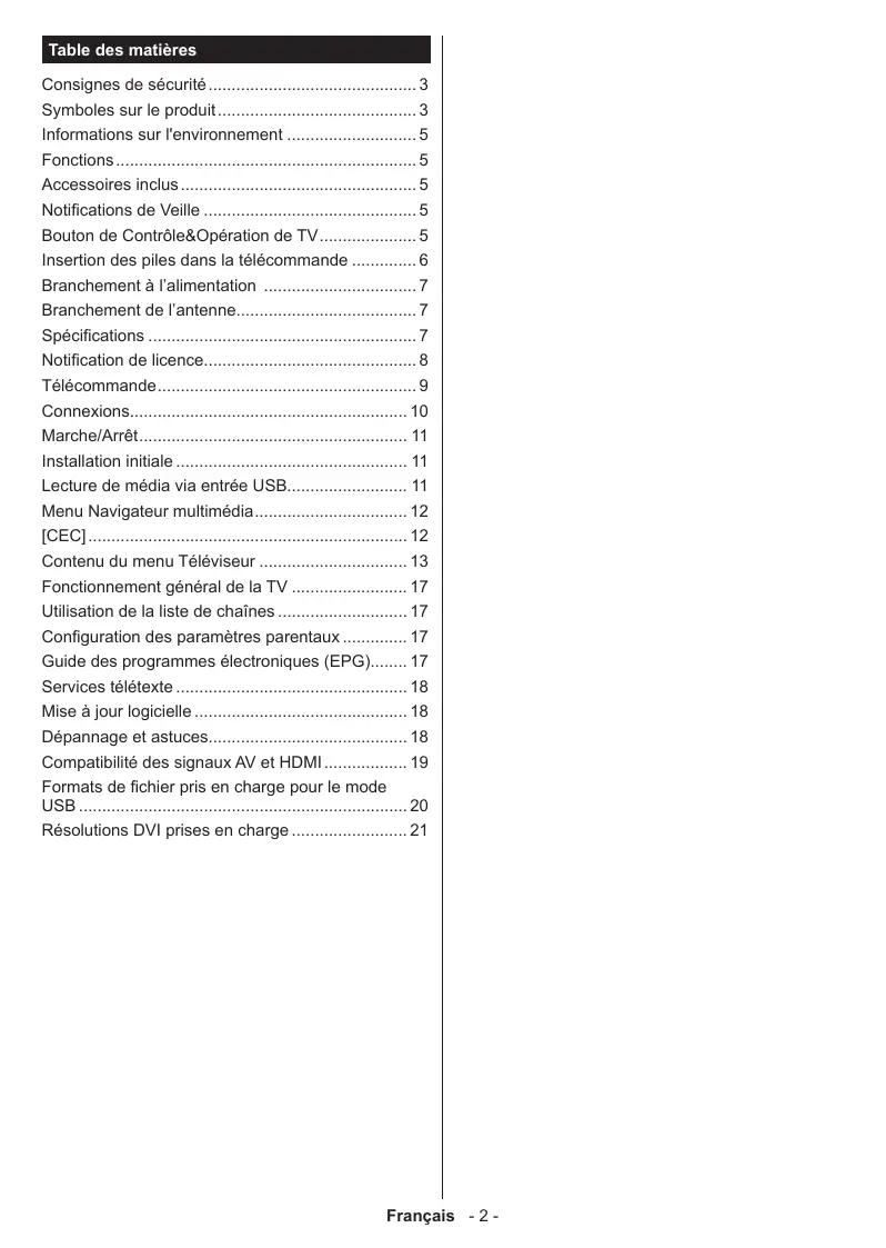 Table des matières Consignes de sécurité Symboles sur le produit... Informations sur l'environnement Fonctions . Accessoires inclus … Notifications de Veille Bouton de Contrôle&Opération de TV... Insertion des piles dans la télécommande … Branchement à l'alimentation … Branchement de l'antenne... Spécifications . Notification de licence. Télécommande. Connexions. Marche/Arrêt……… Installation initiale … Lecture de média via entrée USB... Menu Navigateur multimédia. ICEC] en Contenu du menu Téléviseur … Fonctionnement général de la TV. Utilisation de la liste de chaînes . Configuration des paramètres parentaux Guide des programmes électroniques (EPG) Services télétexte …. Mise à jour logicielle . Dépannage et astuces... Compatibilité des signaux AV et HDMI... Farnata de lier pris an charge pour a mode USB nn 20 Résolutions DVI prises en charge … Français -2-
