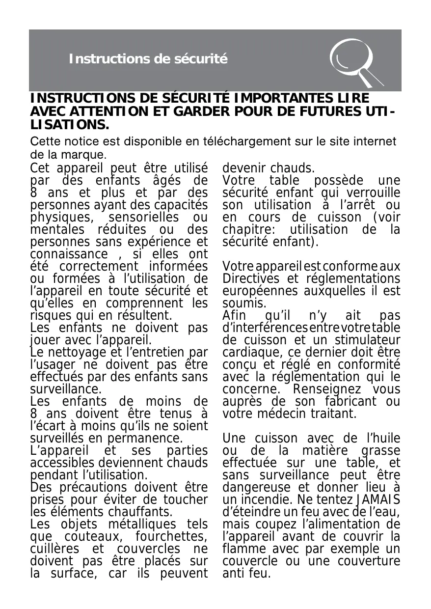 Votre table possède une sécurité enfant qui verrouille son utilisation à l'arrêt ou en cours de cuisson (voir chapitre: utilisation de la sécurité enfant).