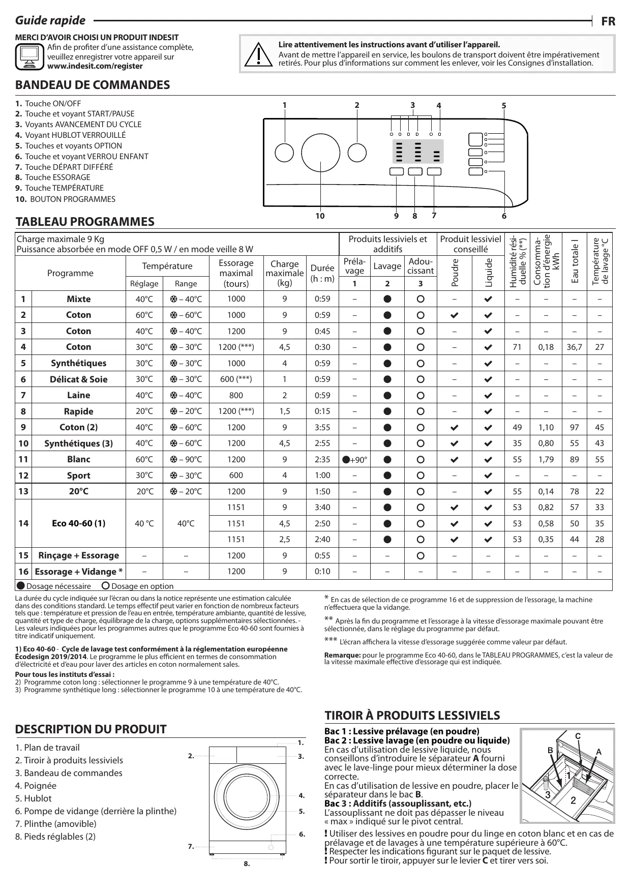 TABLEAU PROGRAMMES Charge maximale 9 Kg Produits lessiviels et [Produit lessiviel| 3] 48 | = [eu Puissance absorbée en mode OFF 0,5 W / en mode veille 8W additifs conseillé LE ÊË a + 3 Fa 3 = $ 5 £ La Température | Essorage | Charge | bre | P'l2: |Lavage| Adou| 8 | % |S2199E| 8 | 25 Programme maximal |maximale (h:m) vage cissant 3 Es 216< 8 |£v Réglage | Range (tours) (kg) M 1 2 3 ê 5 LIL met 1 Mixte 40°C | #-40C 1000 9° 0:59 | - Q Q] : v : : : 2 Coton 60°C | &-60°C 1000 9 0:59 | - Q o v v : : 3 40°C | #-40C 1200 9 0:45 | - QU Q] - v - - - | - 4 30°C | #-30°C | 1200 (***) 45 030 | - Q e] : v [71/0018 |367| 27 5 30°C | &-30C 1000 4 0:59 | - Q Q] : v : : - | - 6 Délicat & Soie 30°C | #-30°C | 600 (**) 1 0:59 | - Q Q] : v : : - | - 7 Laine 40°C | #-40C 800 2 0:59 | - Q Q] : v : : - | - 8 Rapide 20°C | #-20°C | 1200 (***) 1,5 015 | - Q Q] : v : : - | - 9 Coton (2) 40°C | 60°C 1200 9 3:55 - e oO La v 49 | 1,10 | 97 | 45 10] Synthétiques (3) 40°C | 60°C 1200 45 255 | - e o v v | 35 | 080 | 55 | 43 11 Blanc 60°C | &-90°C 1200 9 235 |@+90°| © Q] v v 155 | 179 | 89 | 55 12 Sport 30°C | #&-30C 600 4 1:00 | — Q Q] : v : : = | - 13 20°C 20°C | #-20C 1200 9 1:50 | - Q e] : # 155014 | 78 | 2 1151 9 3:40 - Li oO La Ca 53 | 0,82 | 57 | 33 14 Eco 40-60 (1) 40°C 40°C 1151 45 2:50 = e oO La v 53 | 0,58 | 50 | 35 1151 25 2:40 _ Li oO La Ca 53 | 035 | 44 | 28 15| Rinçage + Essorage - - 1200 9 0:55 - - Q] - - - - - - 16|Essorage + Vidange*| — - 1200 9° 0:10 | - - - - - - - - | - @ Dosage nécessaire © Dosage en option La durée du cycle indiquée sur l'écran ou dans la notice représente une estimation calculée dans des conditions standard. Le temps effectif peut varier en fonction de nombreux facteurs tels que : température et pression de l'eau en entrée, température ambiante, quantité de lessive, quantité et type de charge, équilibrage de la charge, options supplémentaires sélectionnées. - Les valeurs indiquées pour les programmes autres que le programme Eco 40-60 sont fournies à titre indicatif uniquement