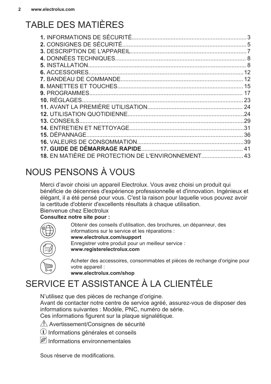 l'avoir choisi un appareil Electrolux. Vous avez choisi un produit qui néficie de décennies d'expérience professionnelle et d'innovation. Ingénieux et élégant, il a été pensé pour vous. C'est la raison pour laquelle vous pouvez avoir la certitude d'obtenir d'excellents résultats à chaque utilisation. Bienvenue chez Electrolux Consultez notre site pour : Obtenir des conseils d'utilisation, des brochures, un dépanneur, des informations sur le service et les réparations : www.electrolux.com/support Enregistrer votre produit pour un meilleur service : www.registerelectrolux.com Acheter des accessoires, consommables et pièces de rechange d'origine pour votre appareil : www.electrolux.com/shop