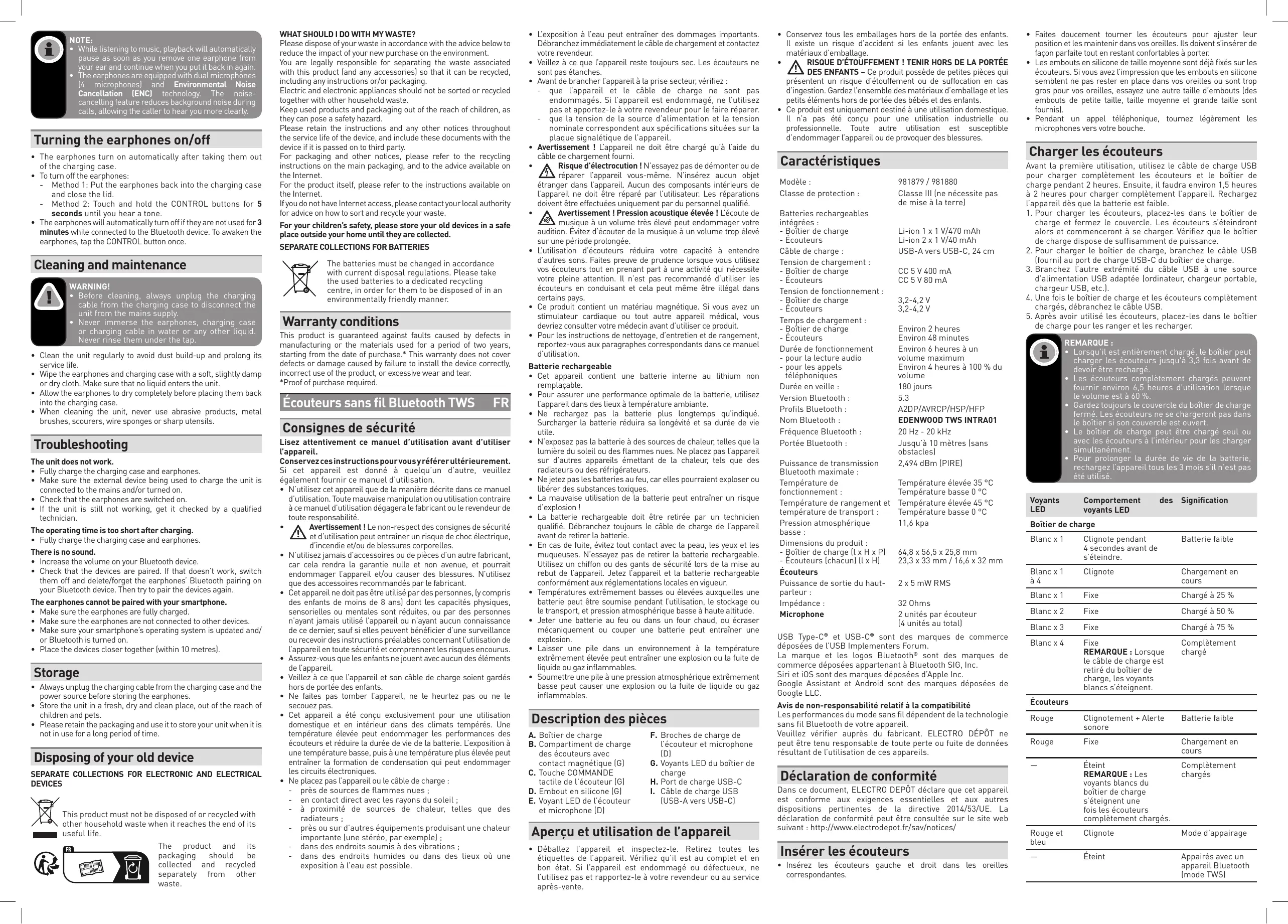 - La fonction d'assistant vocal fonctionne avec Siri (IS) ou Google Assistant (Android). Reportez-vous au mode d'emploi de votre appareil/smartphone pour activer l'assistant vocal avant d'utiliser cette fonction. REMARQUE : + Lorsque vous écoutez de la musique, la lecture s'interrompt automatiquement lorsque vous retirez un écouteur de votre oreille, puis elle reprend lorsque vous le replacez dans votre oreille. Ces écouteurs sont dotés de microphones doubles (4 microphones) et d'une technologie de réduction du bruit active et dynamique (ENC, ou Environmental Noise Cancellation]. Cette fonction de réduction du bruit réduit Le bruit ambiant pendant Les appels, permettant à votre interlocuteur de vous entendre plus clairement. Allumer/éteindre Les écouteurs + Les écouteurs se mettent automatiquement en marche lorsque vous les sortez du boîtier de charge + Pour éteindre les écouteurs : = Méthode 1 : Placez à nouveau les écouteurs dans le boîtier de charge et fermez Le couvercle. = Méthode 2 : Maintenez les touches COMMANDE appuyées pendant 5 secondes jusqu'à ce que vous entendiez un son. + Les écouteurs s'éteindront automatiquement s'ils ne sont pas utilisés pendant 3 minutes Lorsqu'ils sont connectés à l'appareil Bluetooth. Pour sortir Les écouteurs du mode veille, appuyez une fois sur La touche COMMANDE. Nettoyage et entretien AVERTISSEMENT ! + Avant Le nettoyage, débranchez toujours Le câble de charge du boîtier de charge pour débrancher l'appareil de l'alimentation secteur. + Ne plongez jamais les écouteurs, Le boîtier de charge ou Le câble de charge dans l'eau ou tout autre liquide. Ne Les rincez jamais sous le robinet. + Nettoyez régulièrement l'appareil pour éviter l'accumulation de poussière et prolonger sa durée de vie. + Essuyez les écouteurs et le boîtier de charge avec un chiffon doux, légèrement humide ou sec. Veillez à ce qu'aucun liquide ne pénètre dans l'appareil. + Laissezles écouteurs sécher complètement avant de les replacer dans le boîtier de charge. + Pour le nettoyage de l'appareil, n'utilisez jamais de produits abrasifs, de brosses métalliques, d'éponges à récurer ou d'outils pointus. Guide de dépannage L'appareil ne fonctionne pas. + Chargez complètement le boîtier de charge et les écouteurs. + Vérifiez que l'appareil externe utilisé pour charger l'appareil est bien branché au secteur et/ou allumé. + Vérifiez que les écouteurs sont allumés. + Si l'appareil ne fonctionne toujours pas, faites-le vérifier par un technicien qualifié. La durée de fonctionnement est trop courte après le chargement. + Chargez complètement le boîtier de charge et les écouteurs. ILn'y a pas de son. + Augmentez le volume sur votre appareil Bluetooth. + Vérifiez que les appareils sont appairés. Si cela ne fonctionne pas, éteignez-les et supprimez/oubliez l'appairage Bluetooth des écouteurs sur votre appareil Bluetooth. Réessayez ensuite d'appairer les appareils. Les écouteurs ne peuvent pas être appairés avec votre smartphone. + Assurez-vous que les écouteurs sont complètement chargés. + Vérifiez que les écouteurs ne sont pas connectés à d'autres appareils. + Assurez-vous que le système d'exploitation de votre smartphone est mis à jour et/ou que le Bluetooth est activé. + Rapprochez les appareils (moins de 10 mètres]. Rangement + Débranchez toujours Le câble de chargement du boîtier de charge et de La source d'alimentation avant de ranger les écouteurs. + Rangez l'appareil dans un endroit frais, sec et propre, hors de portée des enfants et des animaux domestiques. + Veuillez conserver l'emballage et l'utiliser pour y ranger l'appareil lorsqu'il est prévu de ne pas l'utiliser pendant une longue période. Mise au rebut de votre an appareil