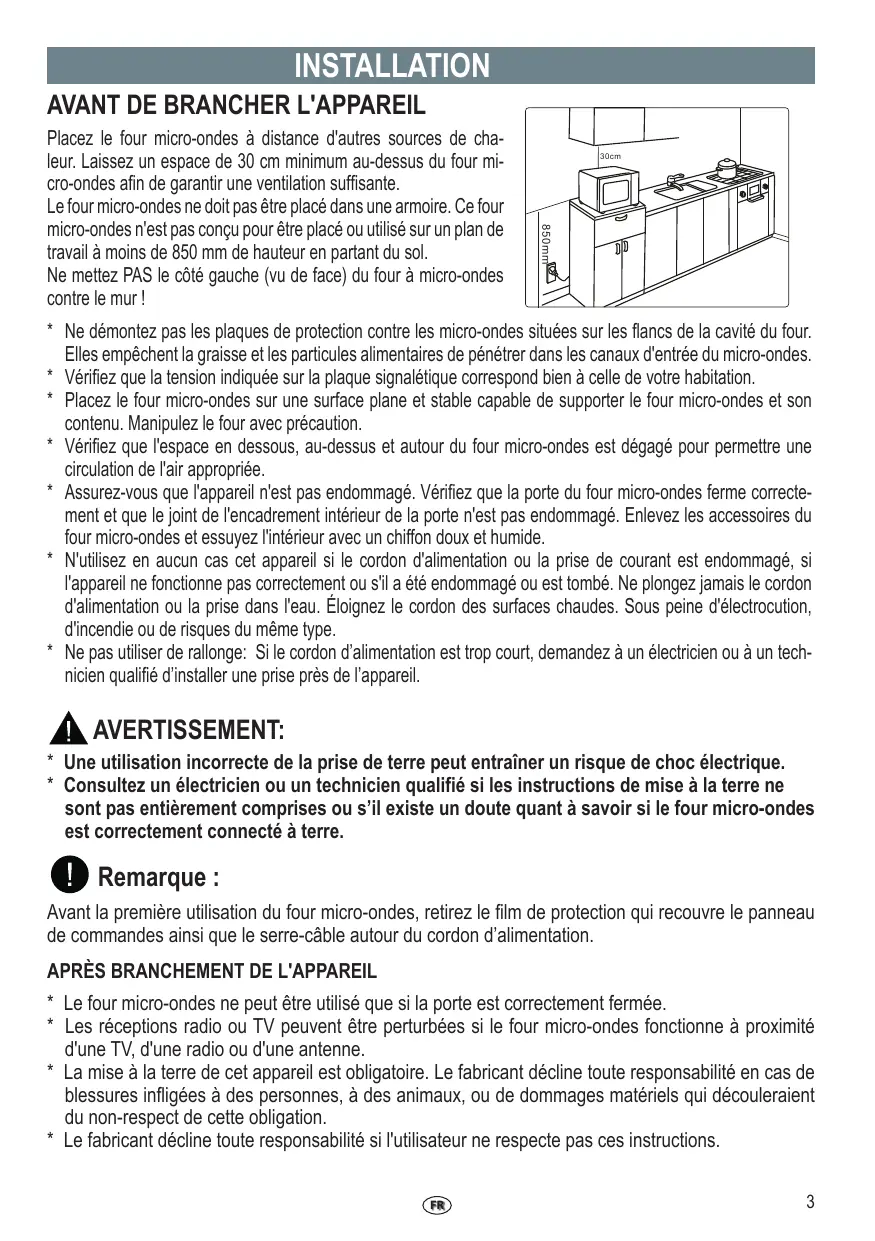 Placez le four micro-ondes à distance d'autres sources de cha- leur. Laissez un espace de 30 cm minimum au-dessus du four mi- cro-ondes afin de garantir une ventilation suffisante. Le four micro-ondes ne doit pas être placé dans une armoire. Ce four micro-ondes n'est pas conçu pour être placé ou utilisé sur un plan de travail à moins de 850 mm de hauteur en partant du sol. Ne mettez PAS le côté gauche (vu de face) du four à micro-ondes contre le mur ! Ne démontez pas les plaques de protection contre les micro-ondes situées sur les flancs de la cavité du four. Elles empêchent la graisse et les particules alimentaires de pénétrer dans les canaux d'entrée du micro-ondes. Vérifiez que la tension indiquée sur la plaque signalétique correspond bien à celle de votre habitation. Placez le four micro-ondes sur une surface plane et stable capable de supporter le four micro-ondes et son contenu. Manipulez le four avec précaution. Vérifiez que l'espace en dessous, au-dessus et autour du four micro-ondes est dégagé pour permettre une circulation de l'air appropriée. Assurez-vous que l'appareil n'est pas endommagé. Vérifiez que la porte du four micro-ondes ferme correcte- ment et que le joint de l'encadrement intérieur de la porte n'est pas endommagé. Enlevez les accessoires du four micro-ondes et essuyez l'intérieur avec un chiffon doux et humide. N'utilisez en aucun cas cet appareil si le cordon d'alimentation ou la prise de courant est endommagé, si l'appareil ne fonctionne pas correctement ou s'il a été endommagé ou est tombé. Ne plongez jamais le cordon d'alimentation ou la prise dans l'eau. Éloignez le cordon des surfaces chaudes. Sous peine d'électrocution, d'incendie ou de risques du même type. Ne pas utiliser de rallonge: Si le cordon d'alimentation est trop court, demandez à un électricien ou à un tech- nicien qualifié d'installer une prise près de l'appareil. À AVERTISSEMENT:
