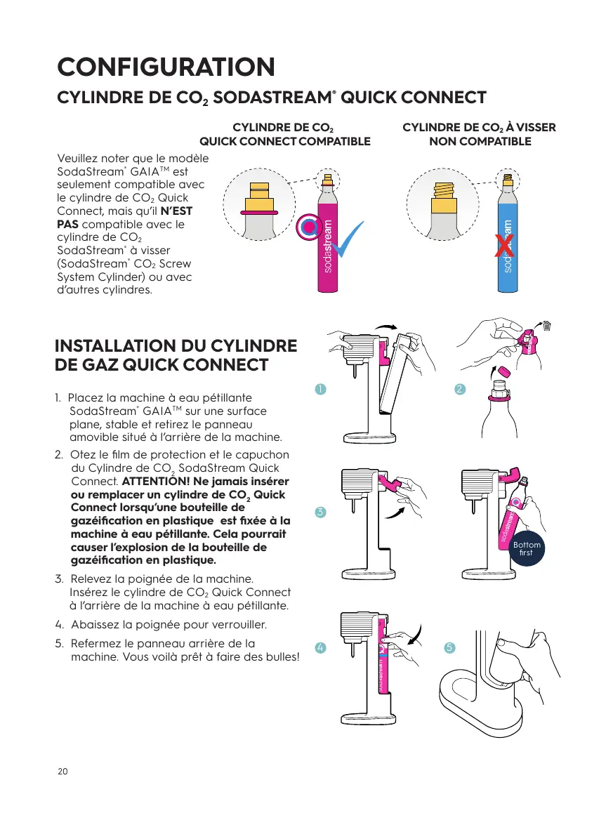 Veuillez noter que le modèle SodaStream' GAIA'" est seulement compatible avec le cylindre de CO: Quick Connect, mais qu'il N'EST PAS compatible avec le cylindre de CO; SodaStream' à visser (SodaStream' CO: Screw System Cylnder) ou avec d'autres cylindres.