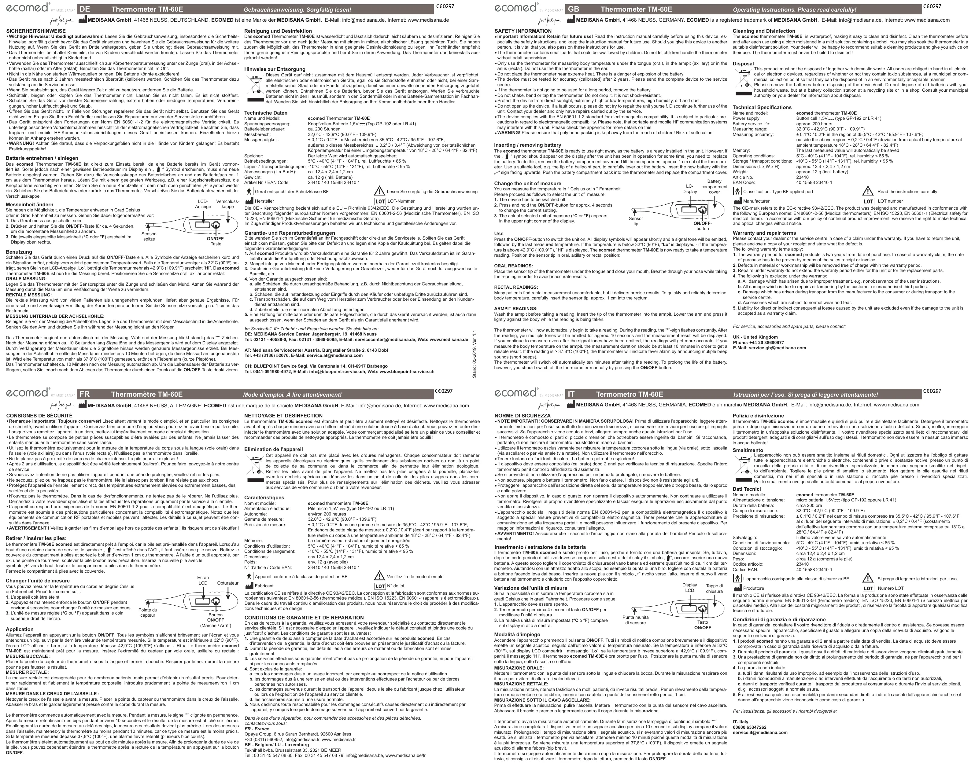 Retrouvez gratuitement la notice de l'appareil TM-60E MEDISANA au format PDF.