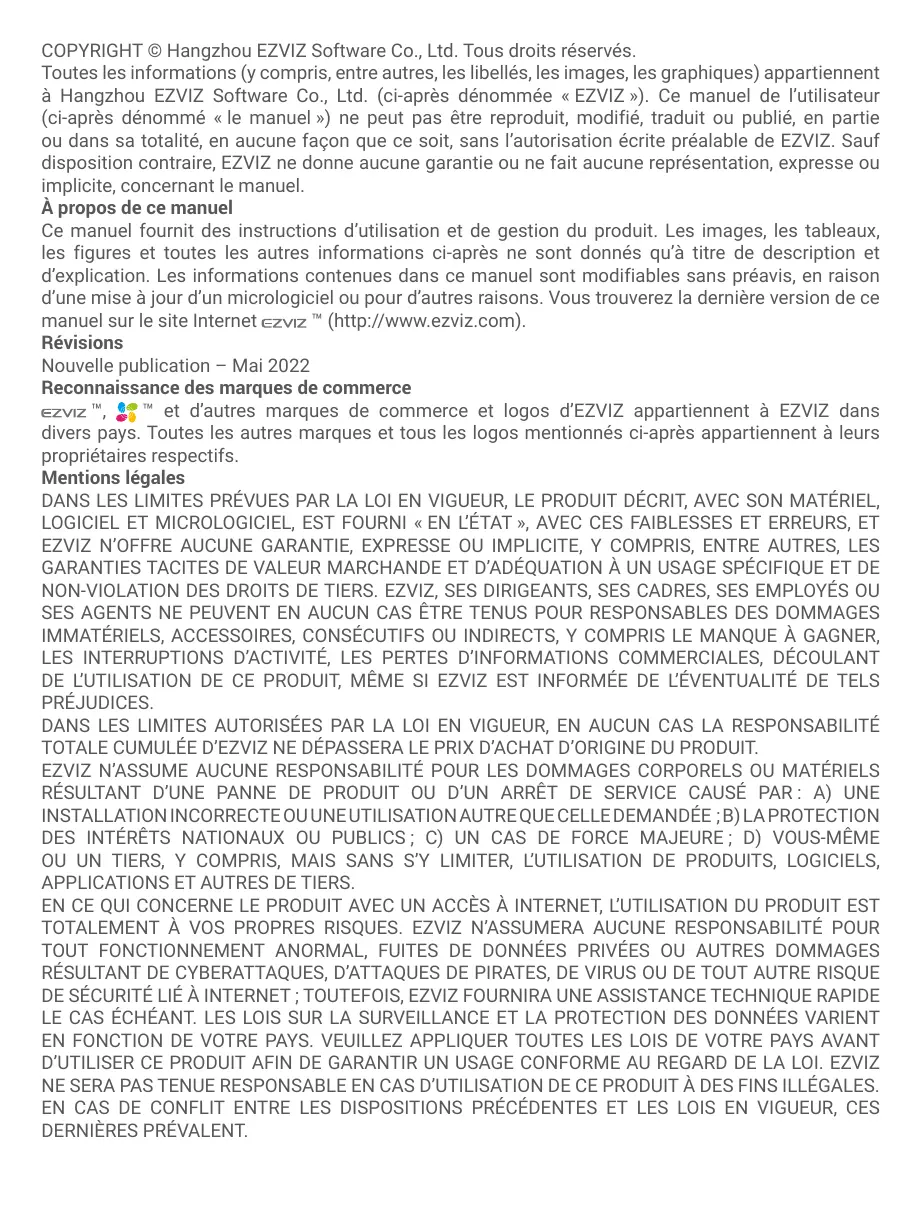 EN CE QUI CONCERNE LE PRODUIT AVEC UN ACCÉS À INTERNET, L'UTILISATION DU PRODUIT EST TOTALEMENT À VOS PROPRES RISQUES. EZVIZ N'ASSUMERA AUCUNE RESPONSABILITÉ POUR TOUT FONCTIONNEMENT ANORMAL, FUITES DE DONNÉES PRIVÉES OU AUTRES DOMMAGES RÉSULTANT DE CYBERATTAQUES, D'ATTAQES DE PIRATES, DE VIRUS OU DE TOUT AUTRE RISQUE DE SECURité LIÉ À INTERNET; TOUTEFOIS, EZVIZ FOURNIRA UNE ASSISTANCE TECHNIQUE RAPIDE LE CAS ÉCHÉANT. LES LOIS SUR LA SURVEILLANCE ET LA PROTECTION DES DONNÉES VARIENT EN FONCTION DE VOTRE PAYS. VEUILLEZ APPLICHER TOUTES LES LOIS DE VOTRE PAYS AVANT D'UTILISER CE PRODUIT AFIN DE GARANTIR UN USAGE CONFORME AU REGARD DE LA LOI. EZVIZ NE SERA PAS TENUE RESPONSABLE EN CAS D'UTILISATION DE CE PRODUIT À DES FINS ILLÉGALES. EN CAS DE CONFLIT ENTRE LES DISPOSITIONS PRÉCEDENTES ET LES LOIS EN VIGUEUR, CES DERNIÈRES PRÉVALENT.